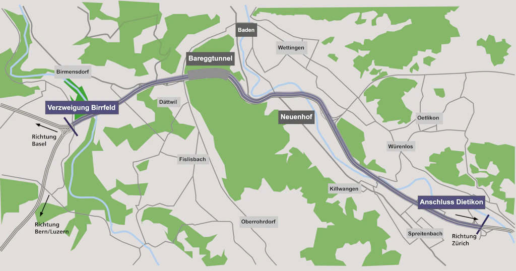Die Anlagen der Betriebs- und Sicherheitsausrüstungen (BSA) sind am Ende ihrer Nutzungsdauer angelangt. In den folgenden Jahren werden die Betriebs- und Sicherheitsausrüstungen auf der Strecke zwischen dem Anschluss Dietikon und der Verzweigung Birrfeld erneuert. Dazu gehören elektromechanische Anlagen wie Lüftungen, Beleuchtungen, Signalisation und Kabelanlagen.