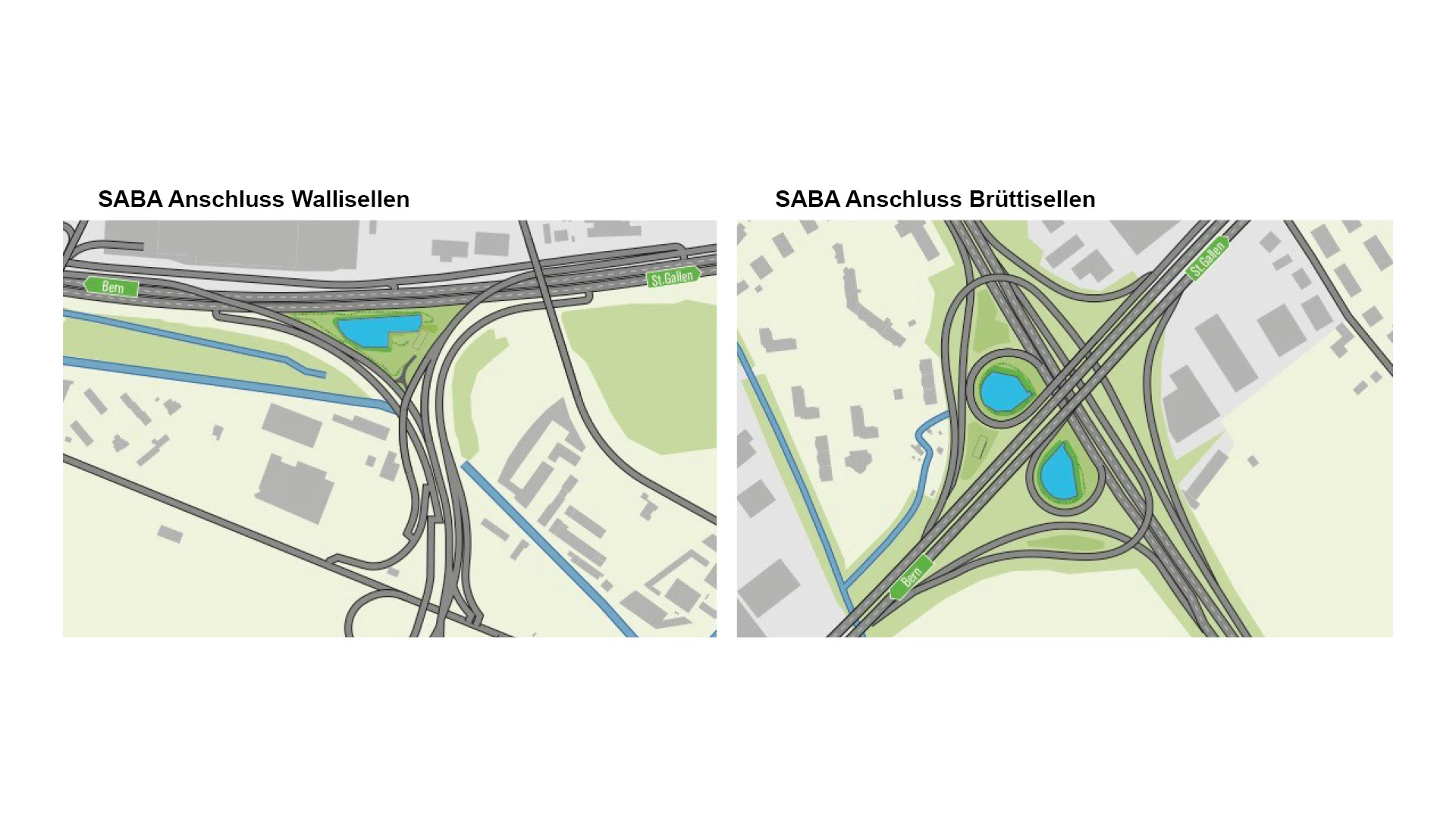 Gemäss den aktuellen Gewässerschutzvorschriften müssen Strassenabwässer von stark befahrenen Strassen gereinigt werden. Da Kläranlagen nicht zur Filtration von Schwermetallen ausgerüstet sind, errichtet das ASTRA im Rahmen von Autobahnaus- und neubauprojekten spezielle Strassenabwasser-Behandlungsanlagen, sogenannte SABA. Im Projektperimeter sind zwei neue SABA in der Dreiecksfläche im Anschluss Wallisellen sowie zwischen den Zufahrtsrampen der Verzweigung Brüttisellen vorgesehen (vgl. Abb.). Zur Kompensation der Rodungen, die in diesem Zusammenhang erforderlich sind, werden Ersatzaufforstungen ausgeführt.