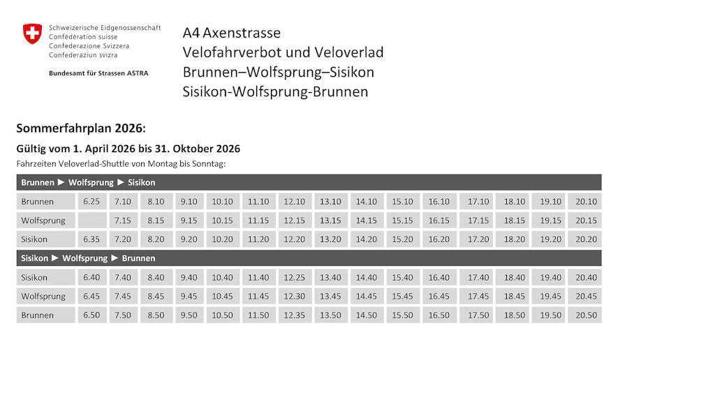 Mit steigenden Temperaturen nimmt im Frühling auch der Veloverkehr wieder zu. Deshalb stellt das Bundesamt für Strassen ASTRA während des Sommerhalbjahres auf der Axenstrasse einen verdichteten Fahrplan für den Veloshuttle mit stündlichen Verbindungen bereit. Der Sommerfahrplan tritt per 1. April 2026 in Kraft und liegt dieser Medienmitteilung bei.