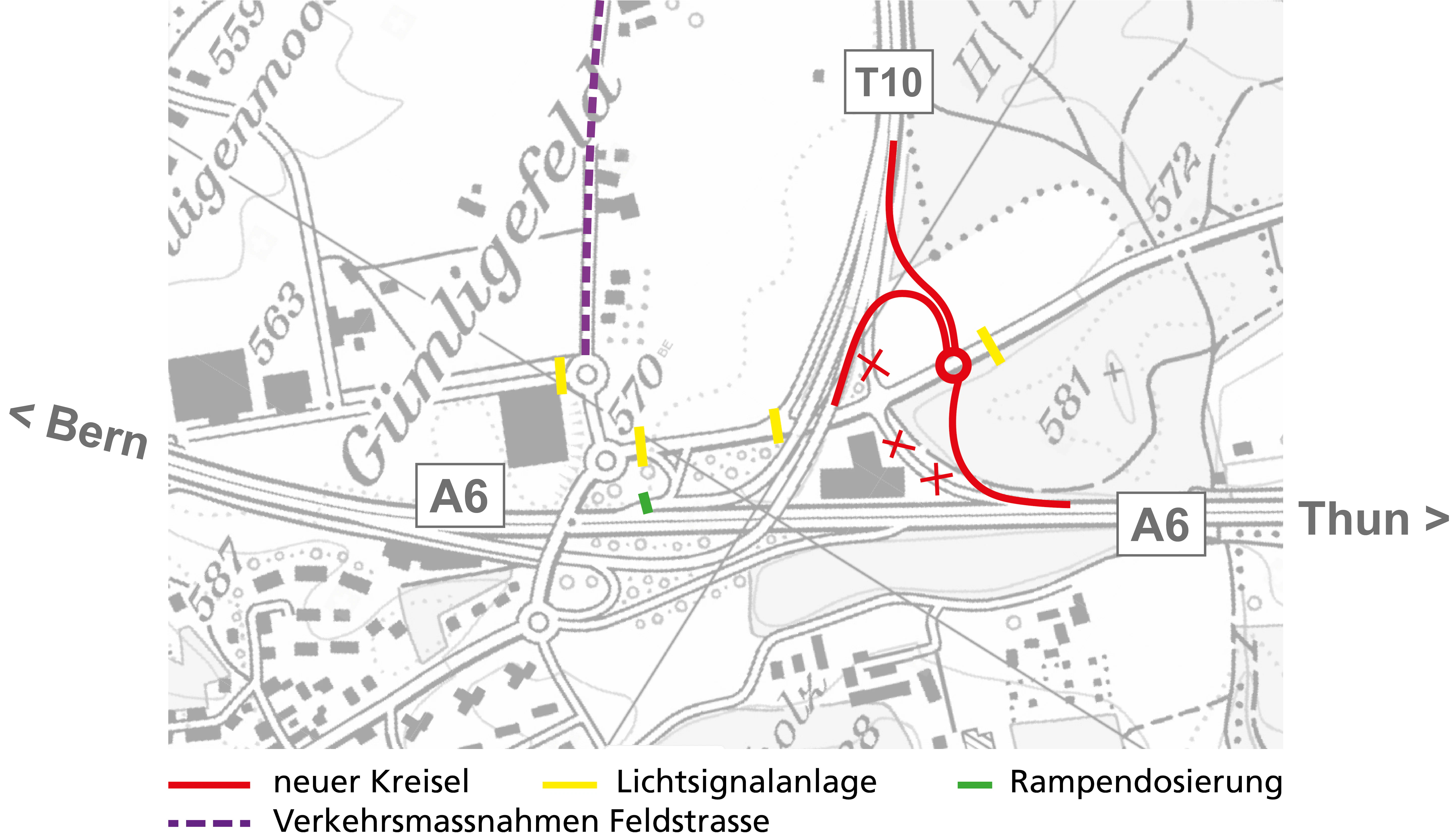 Rot eingezeichnet: Der neue Kreisel Froumholz – das zentrale Element der Umgestaltung. Er wird durch zwei Rampen mit dem Zubringer Worb (T10) verbunden. Das System erhöht die Sicherheit, verflüssigt den Verkehr, entlastet den restlichen Teil des Knotens und schafft eine schnellere Verbindung von der A6 her Richtung Allmendingen.