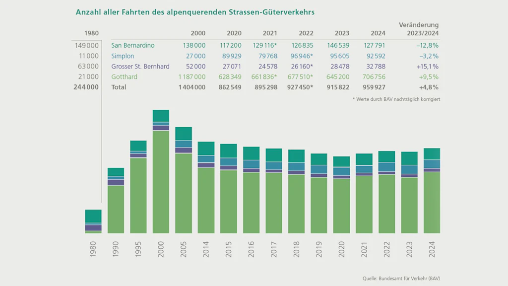 Diese Zahlen stützen sich auf die Zählstellen des ASTRA. Sie beinhalten entsprechend auch Nicht-LSVA-pflichtige Schwerverkehrsfahrzeuge wie Busse oder grosse Wohnmobile. Demgegenüber entstammen die Zahlen zum alpenquerenden Güterverkehr des Bundesamts für Verkehr (BAV) den LSVA-Kontrollanlagen.