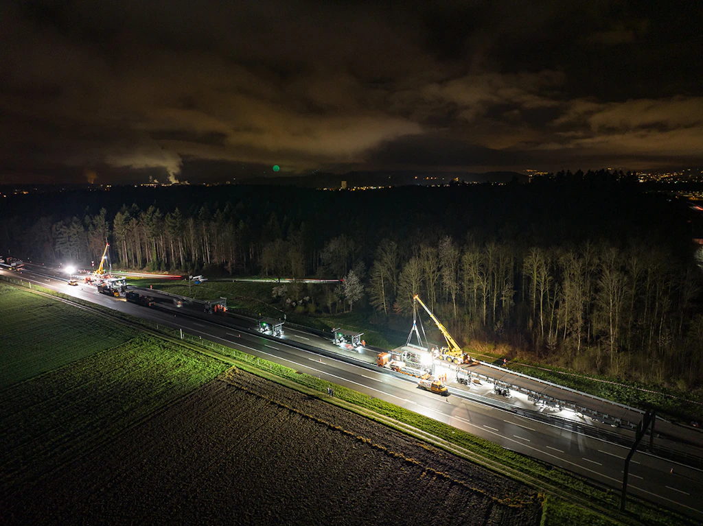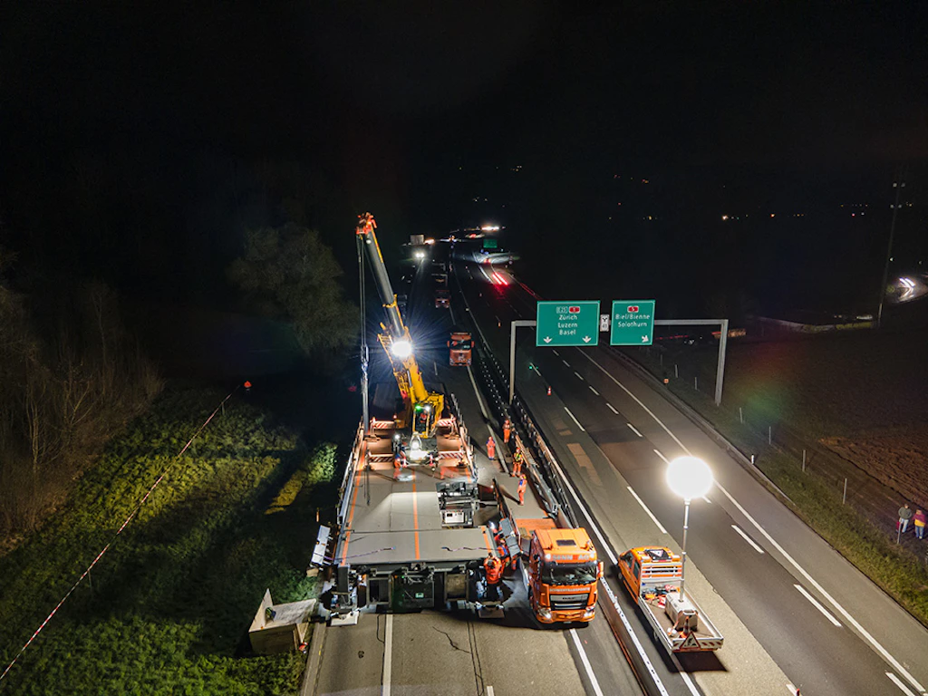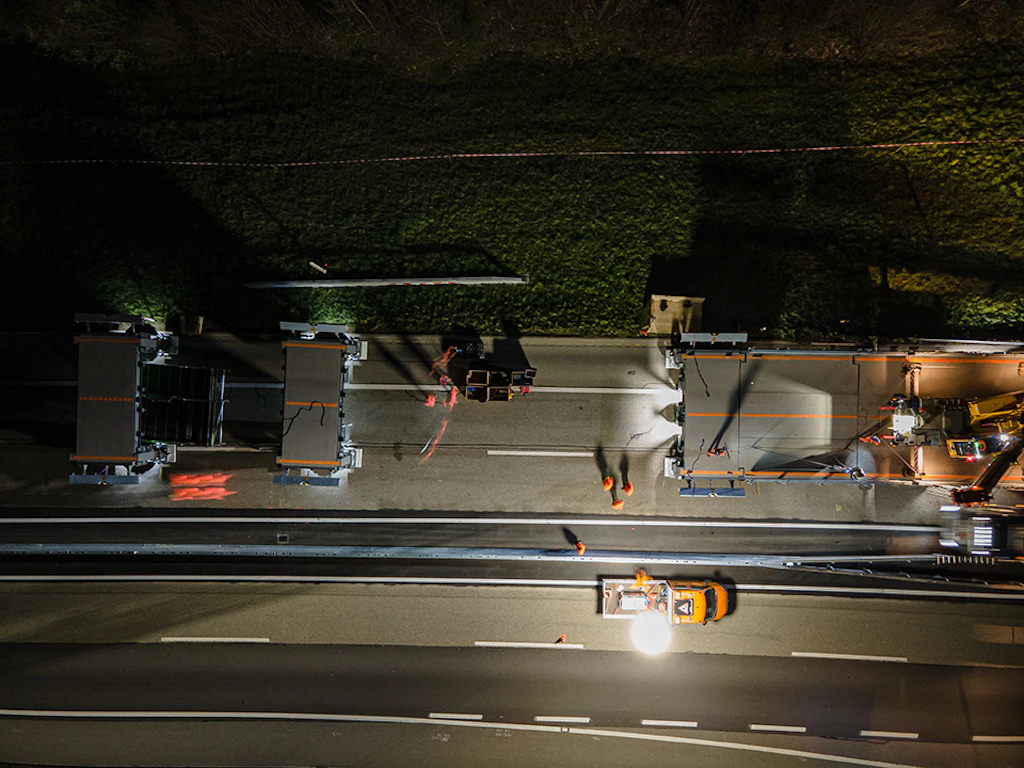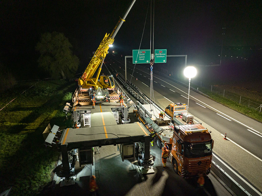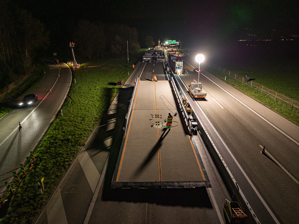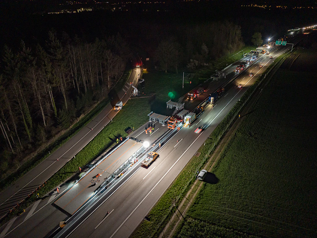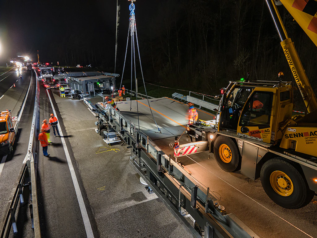 In der ersten Nacht werden die Auf- und die Abfahrtsrampe an den Einsatzort transportiert und zusammengebaut. Der Verkehr wird auf zwei verengten Spuren mit Tempo 60 geführt.