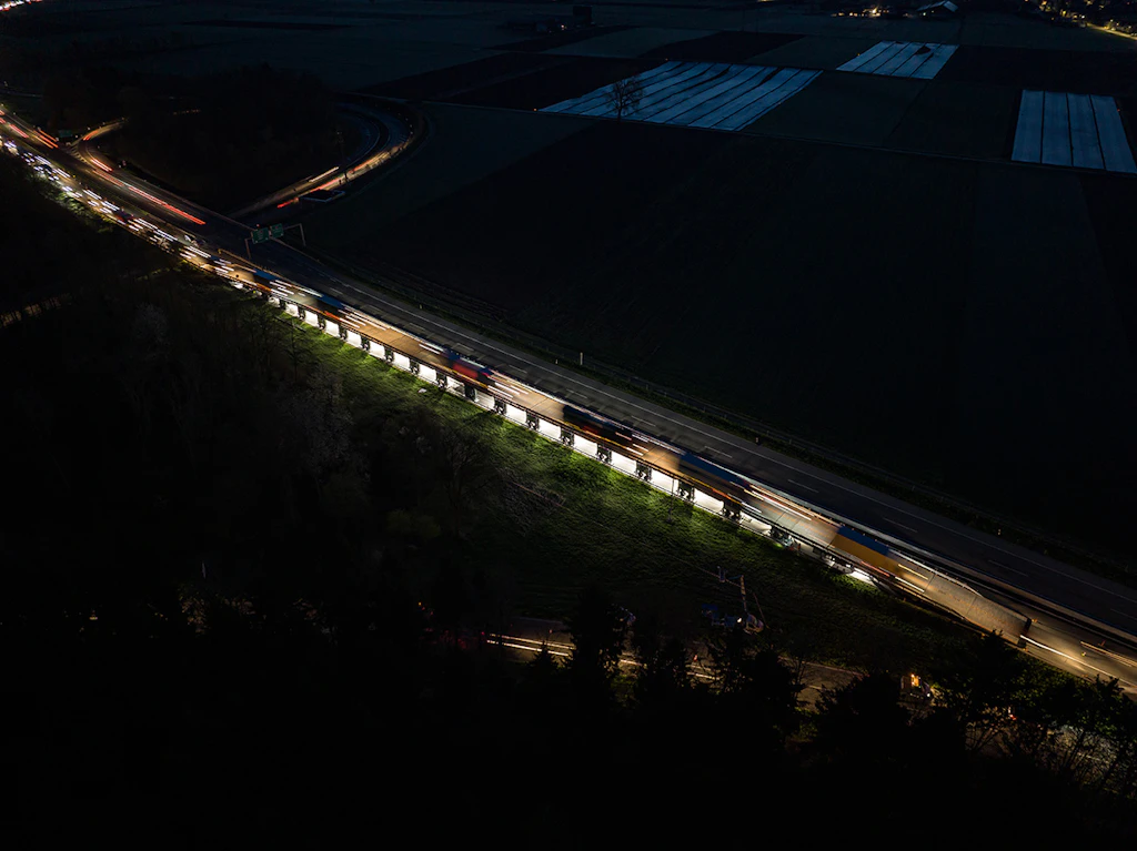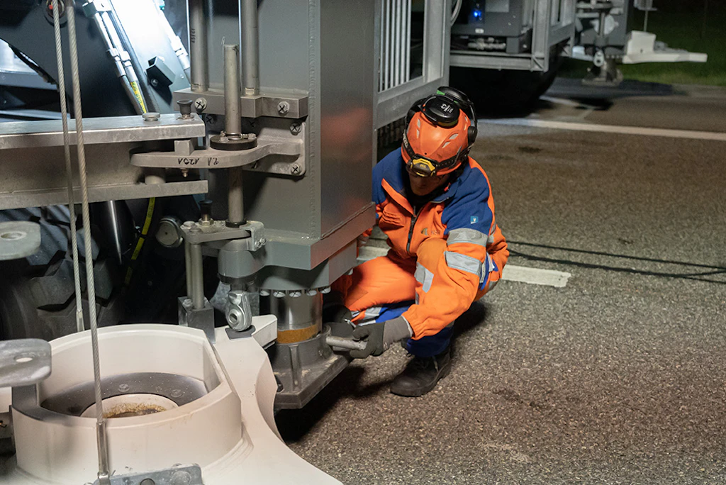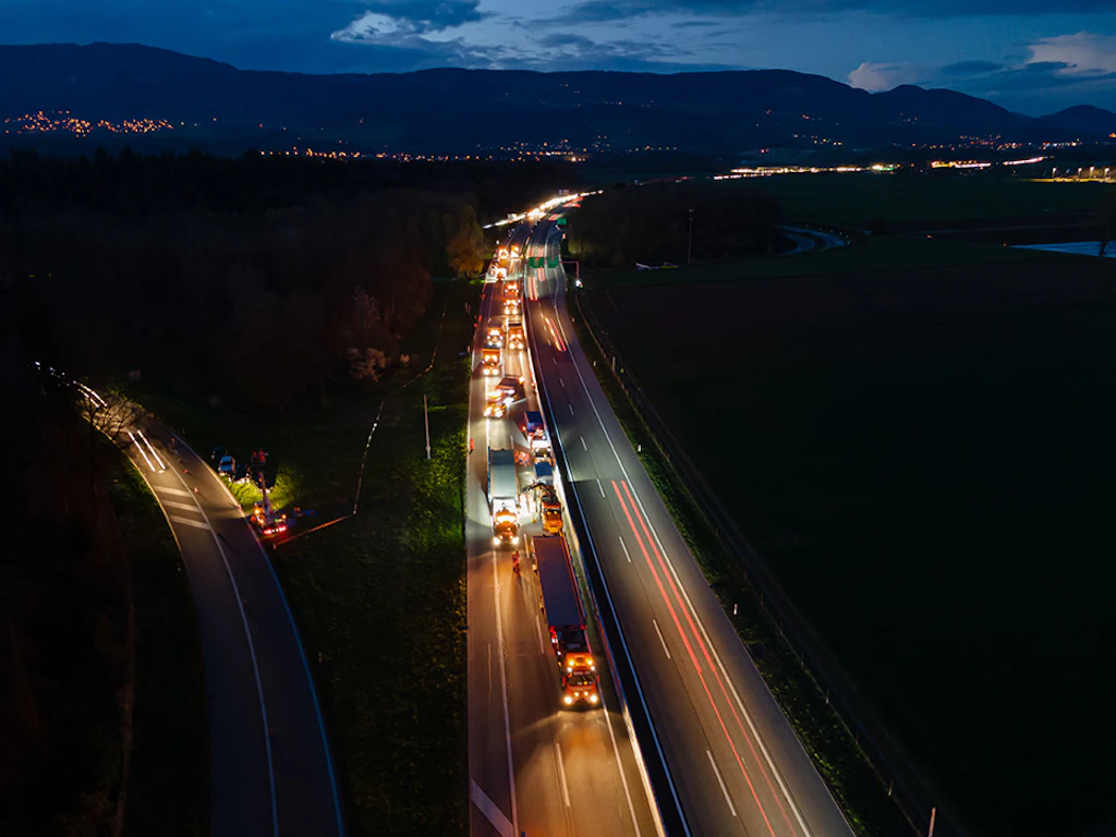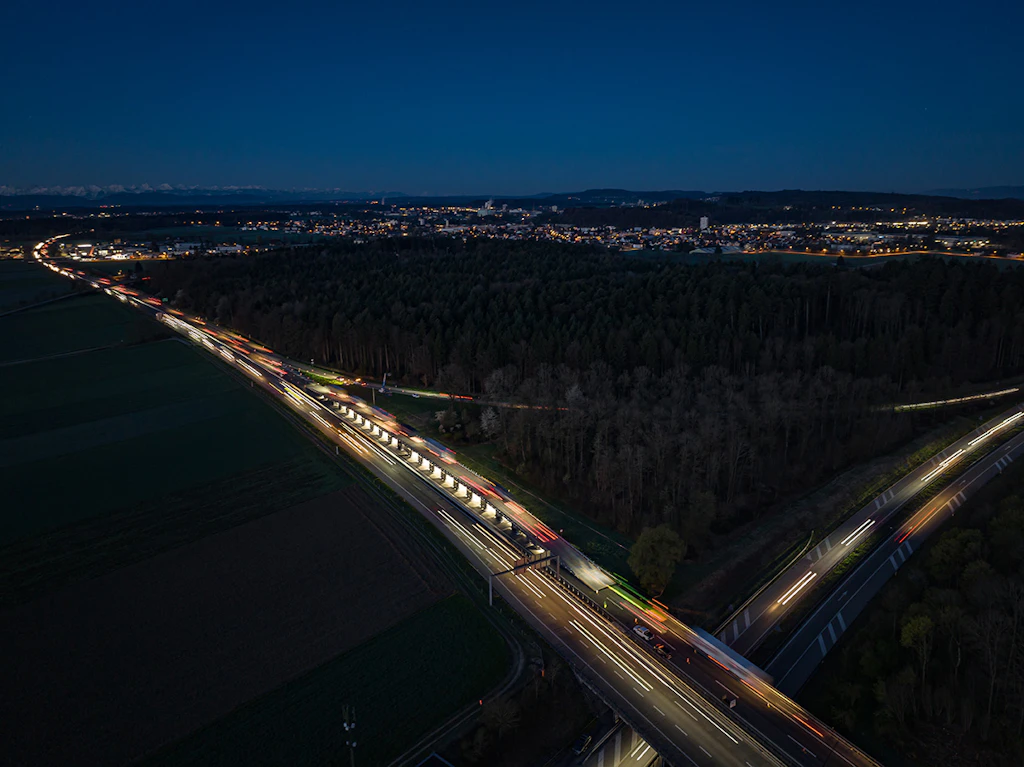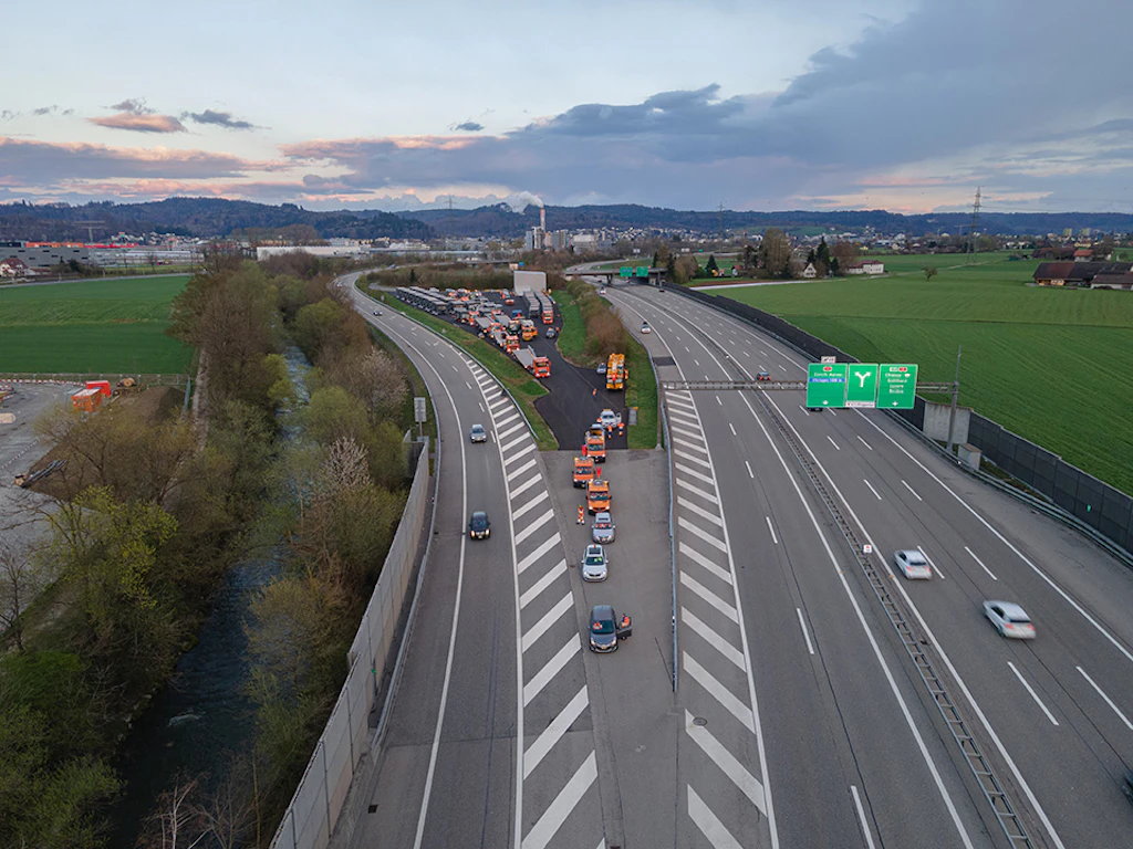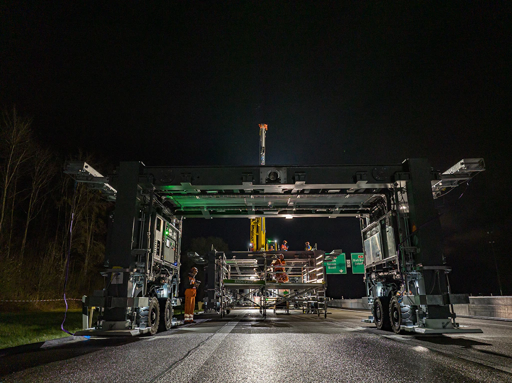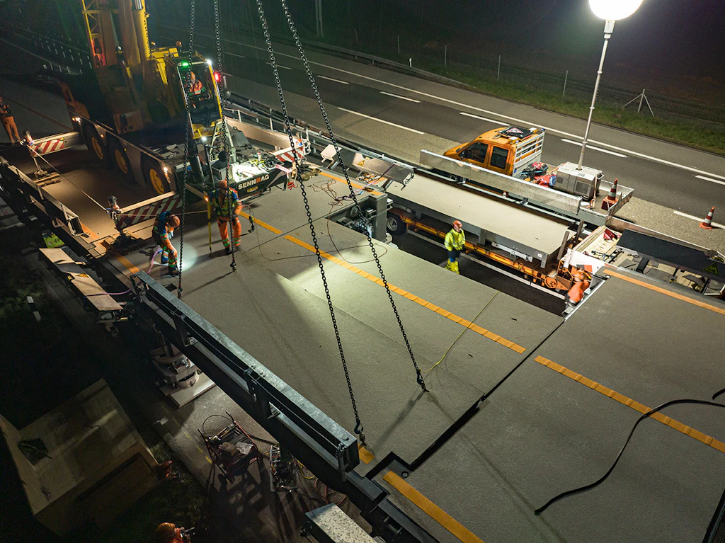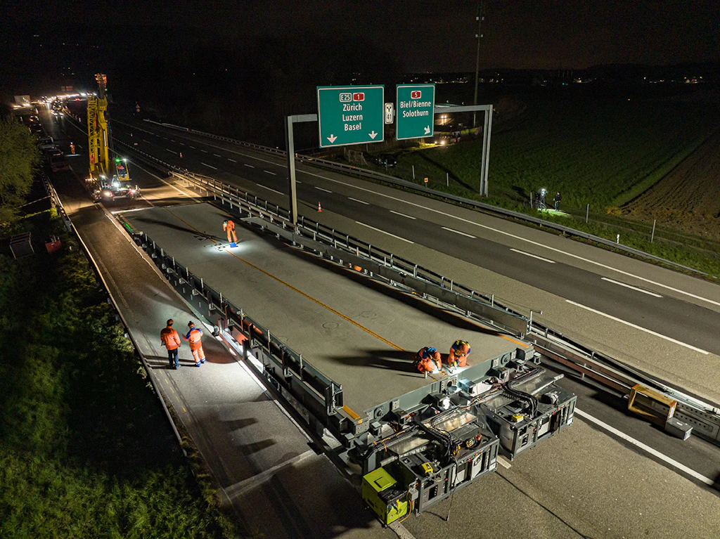In der ersten Nacht werden die Auf- und die Abfahrtsrampe an den Einsatzort transportiert und zusammengebaut. Der Verkehr wird auf zwei verengten Spuren mit Tempo 60 geführt.