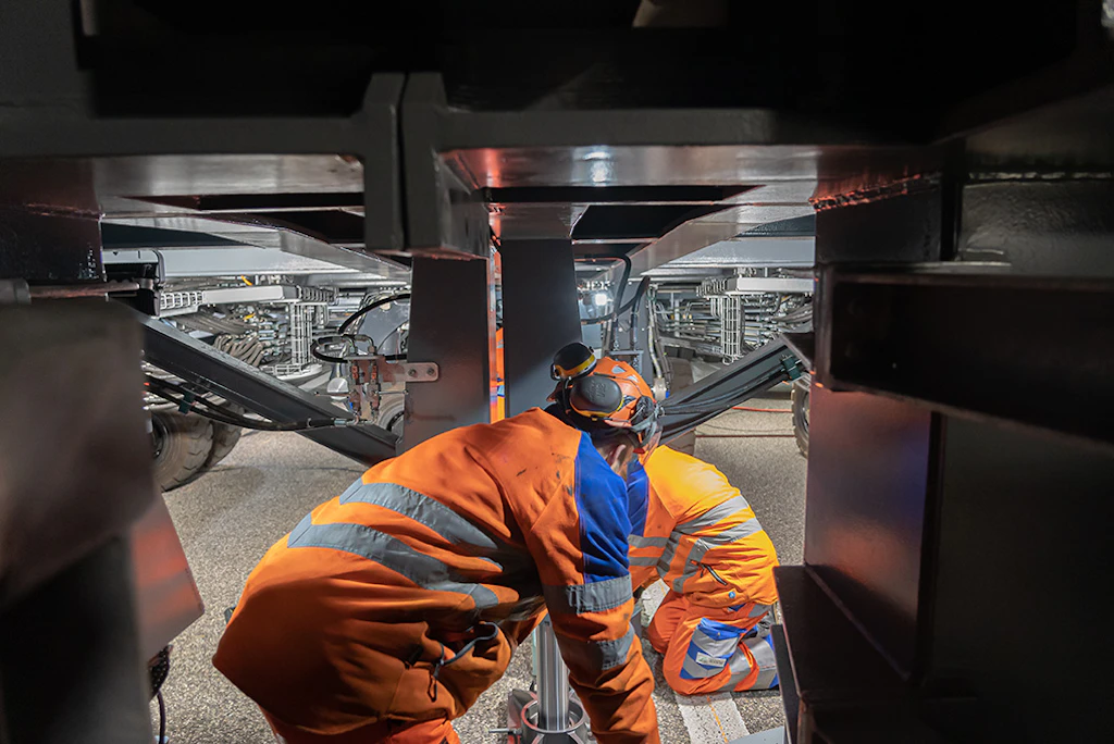 Sind alle Komponenten miteinander verbunden, kann die 256 Meter lange massive Stahlbrücke in Position gebracht werden, damit die erste Bauetappe beginnen kann. Ab dem nächsten Morgen heisst es dann: Oben fahren, unten bauen.