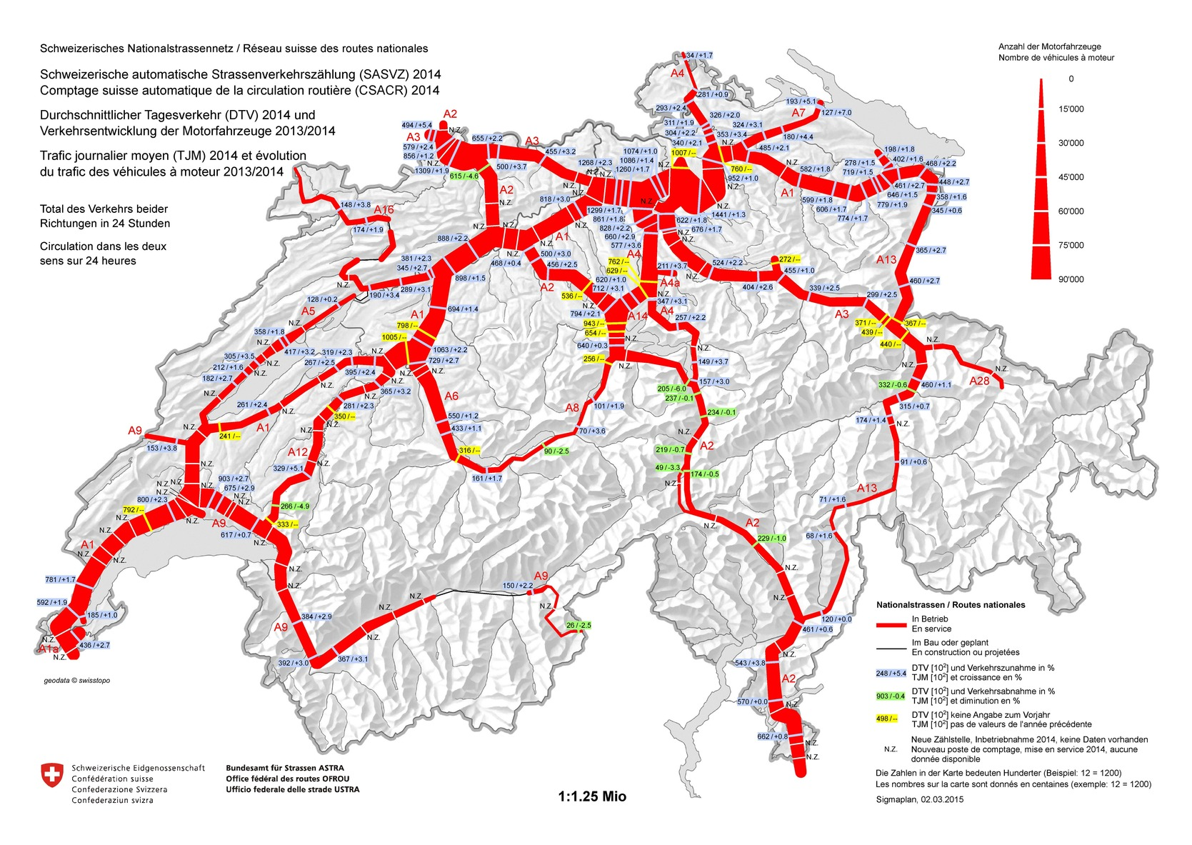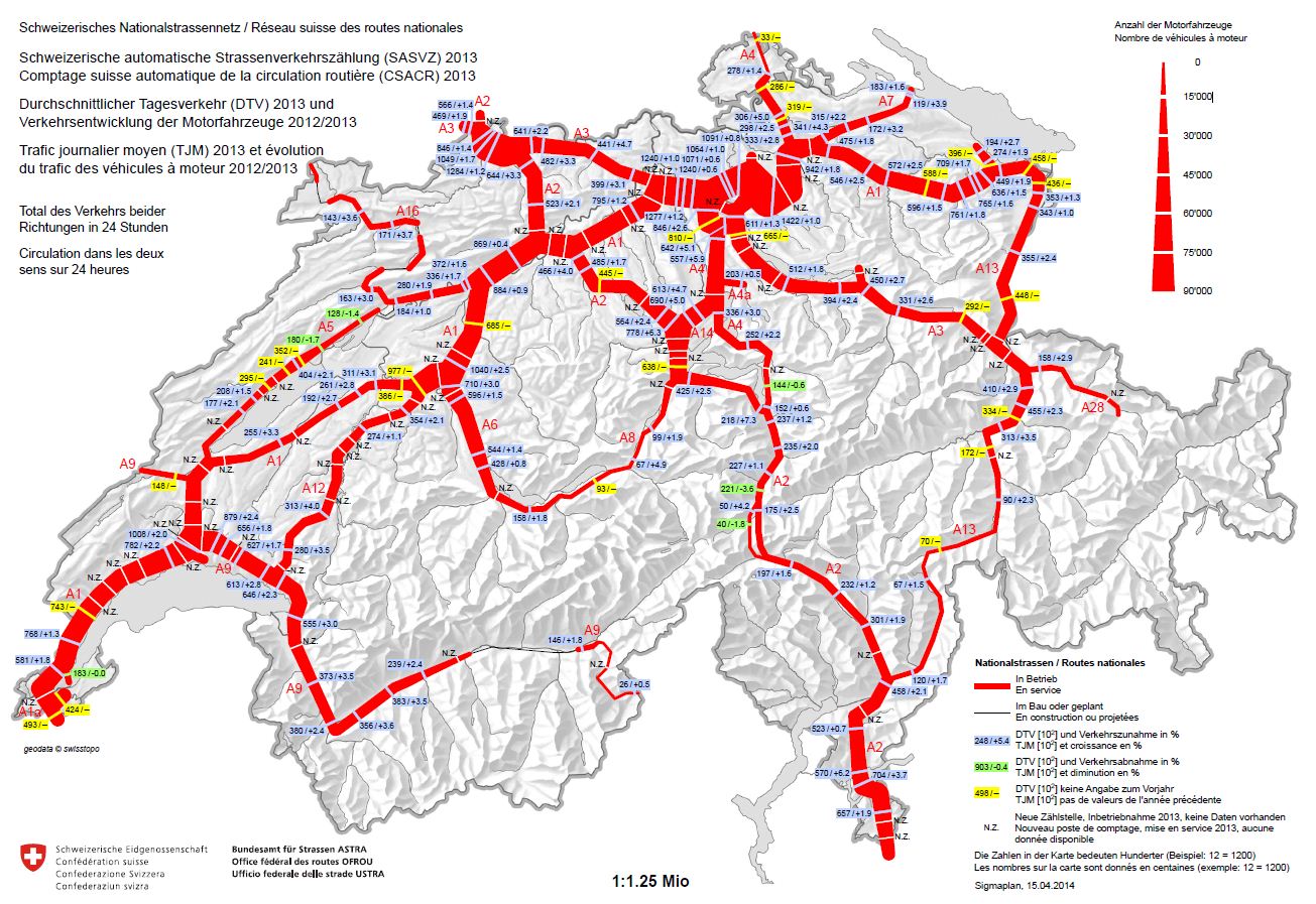 Belastung der Nationalstrassen 2014 - Durchschnittlicher Tagesverkehr und Entwicklung