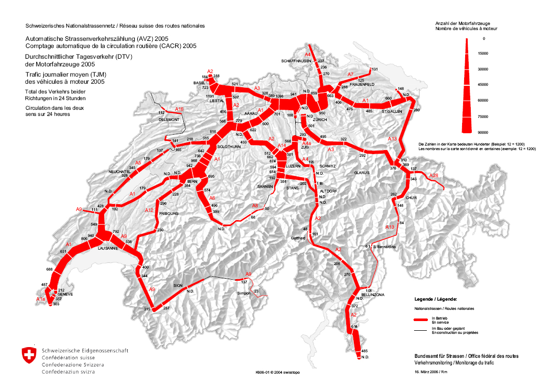 Belastung der Nationalstrassen 2005 - Durchschnittlicher Tagesverkehr und Entwicklung
