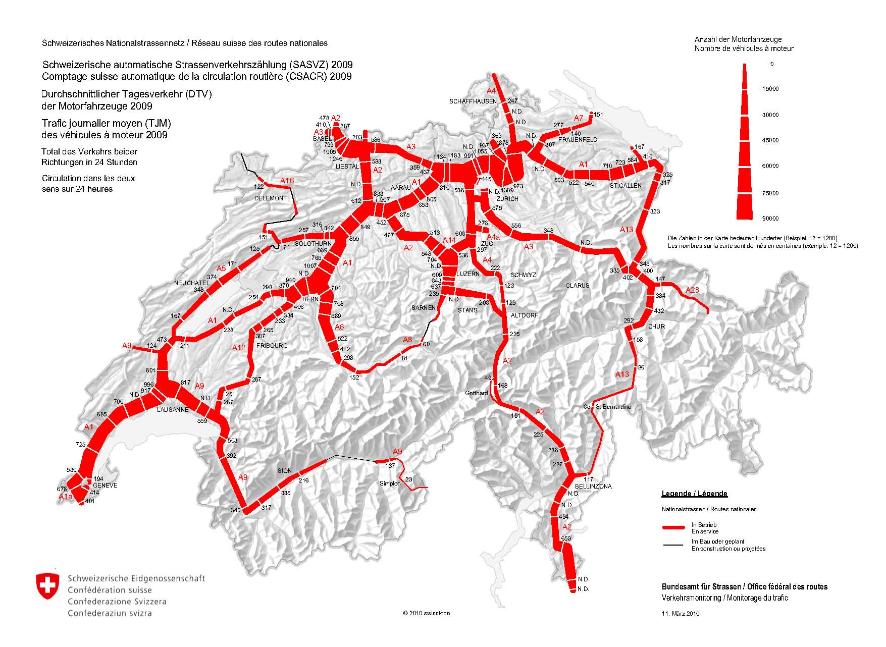 Belastung der Nationalstrassen 2010 - Durchschnittlicher Tagesverkehr und Entwicklung