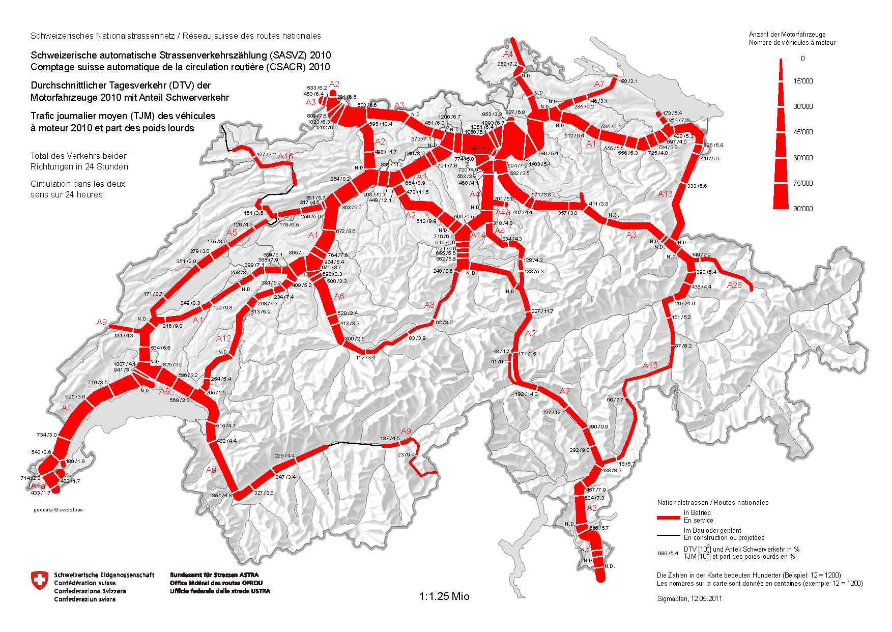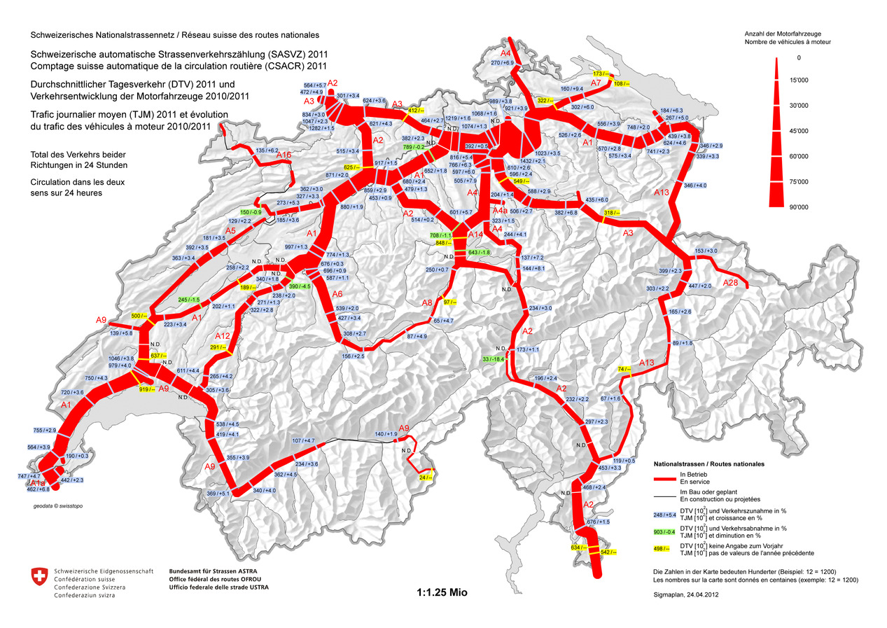 Belastung der Nationalstrassen 2011 - Durchschnittlicher Tagesverkehr und Entwicklung