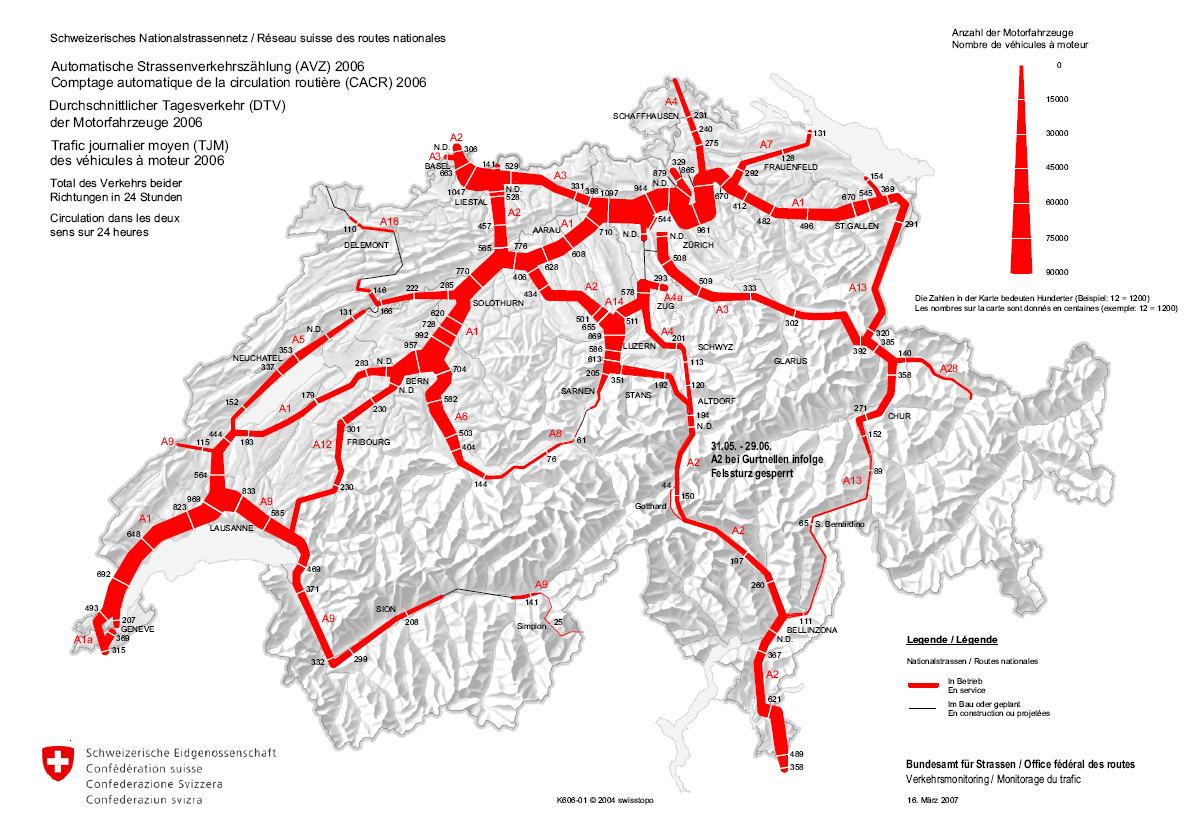 Belastung der Nationalstrassen 2006 - Durchschnittlicher Tagesverkehr und Entwicklung