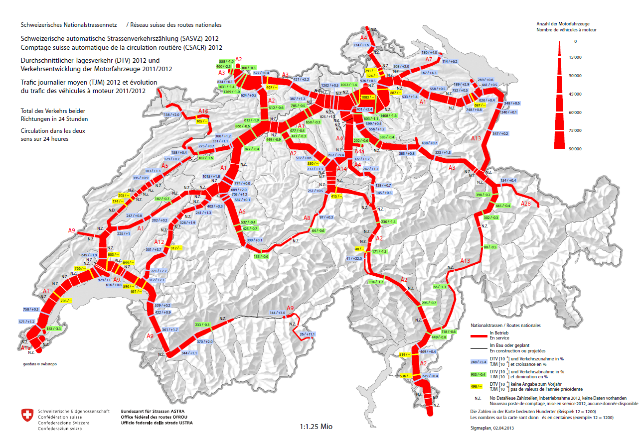 Belastung der Nationalstrassen 2012 - Durchschnittlicher Tagesverkehr und Entwicklung