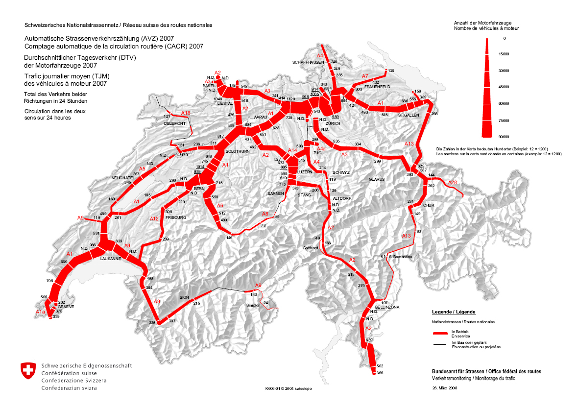 Karte - Belastung der Nationalstrassen 2008