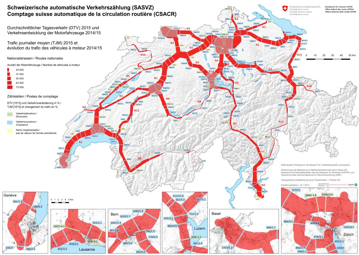 Belastung der Nationalstrassen 2015 - Durchschnittlicher Tagesverkehr und Entwicklung
