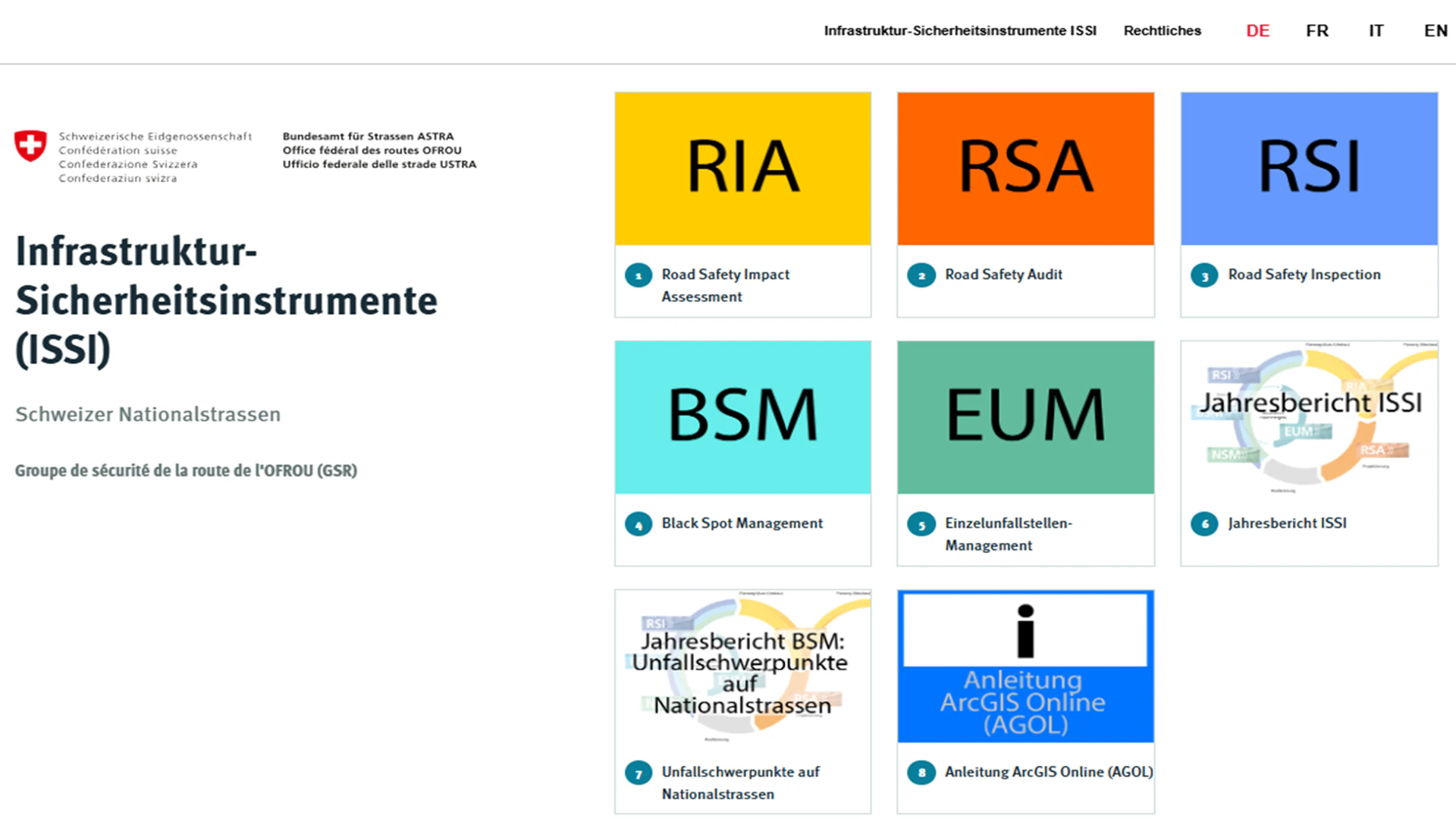 Um die Sicherheit zu erhöhen, hat das Bundesamt für Strassen (ASTRA) sechs Infrastruktur-Sicherheitsinstrumente (ISSI) entwickelt. Verschiedene Berichte dokumentieren deren Anwendung, Mehrwert und Wirksamkeit.