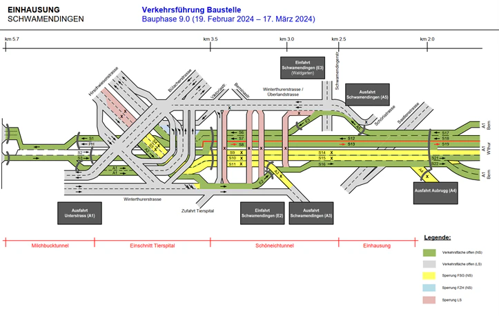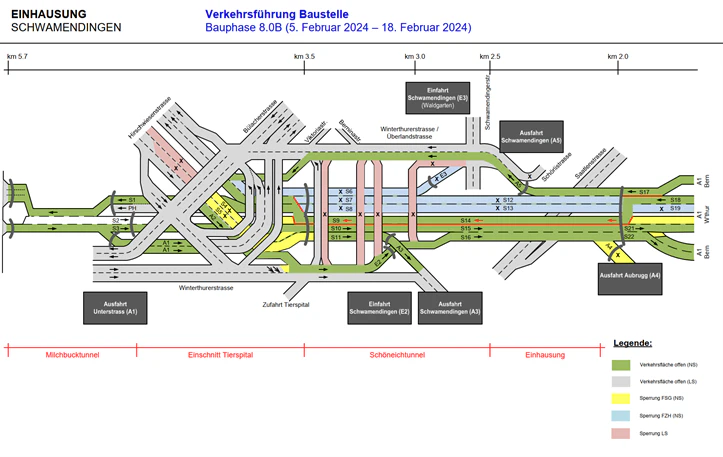 - Der Nationalstrassenverkehr von Winterthur/St. Gallen wird im Gegenverkehr durch die Einhausung/Schöneichtunnel geführt. Eine Benützung der Ausfahrt Schwamendingen (A5) ist nicht möglich. Zudem ist vom 22.01.2024 bis 04.02.2024 auch der Hirschwiesentunnel nicht erreichbar. Die Autobahn kann erst in Zürich Letten wieder verlassen werden.