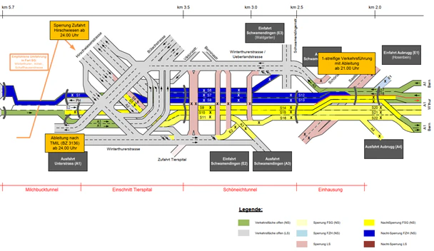 - Die Ableitung des Verkehrs erfolgt über die Ausfahrt Unterstrass. Eine Umfahrungsroute wird signalisiert.