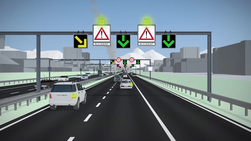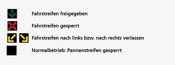 Bei einem Unfall sind die Weisungen auf den Signaltafeln über den Fahrstreifen zu befolgen. Gelbe Pfeile fordern zum Verlassen des vom Unfall betroffenen Fahrstreifens auf. Dieser wird gesperrt und der Verkehr auf die übrigen Fahrstreifen gelenkt.