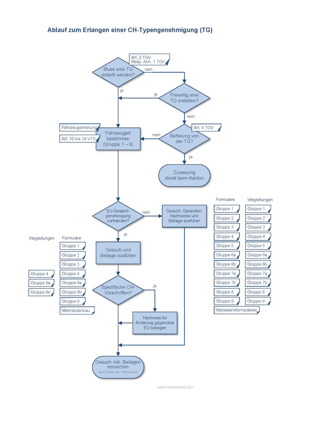 Das Bundesamt für Strassen (ASTRA) stellt fest, ob die einschlägigen schweizerischen Vorschriften bei Fahrzeugen eingehalten sind. Mit der Ausstellung einer schweizerischen Typengenehmigung bzw. einem schweizerischen Datenblatt wird dies bestätigt.