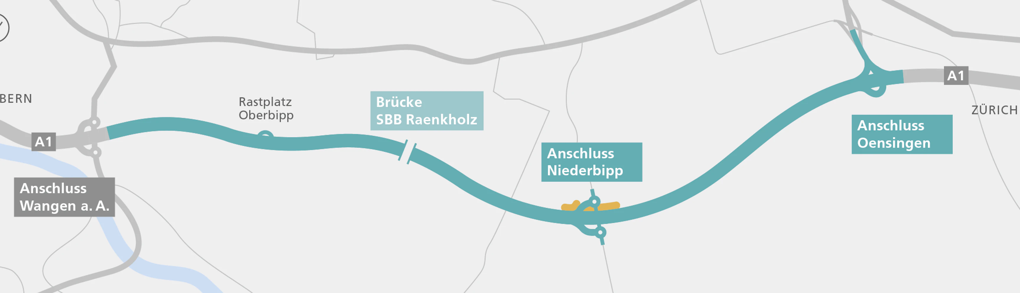 Auf dem Autobahnabschnitt A1 zwischen den Anschlüssen Wangen an der Aare und Oensingen ist neben dem Ausbau auf sechs Streifen auch der Ausbau der Anschlüsse Niederbipp und Oensingen vorgesehen.