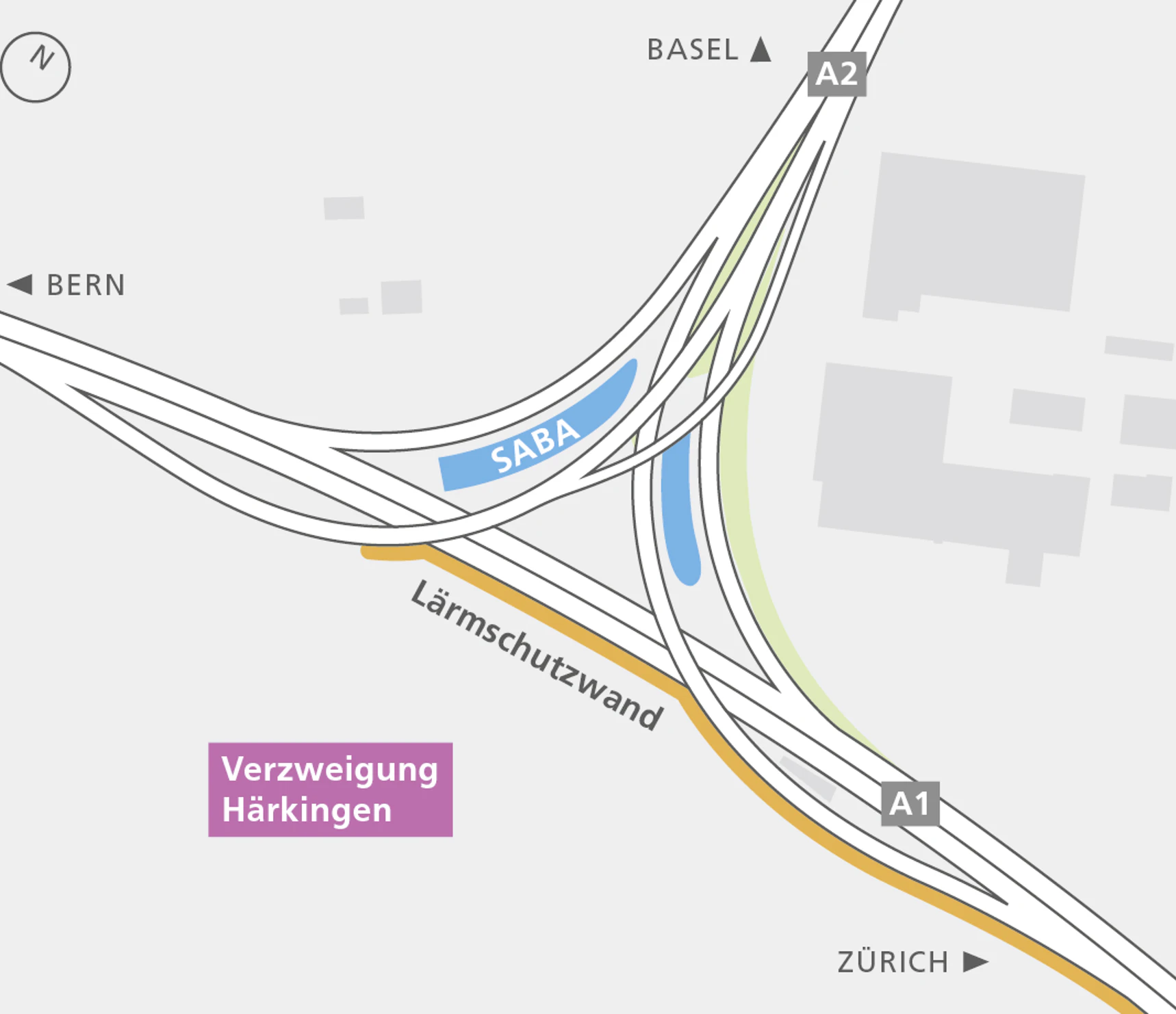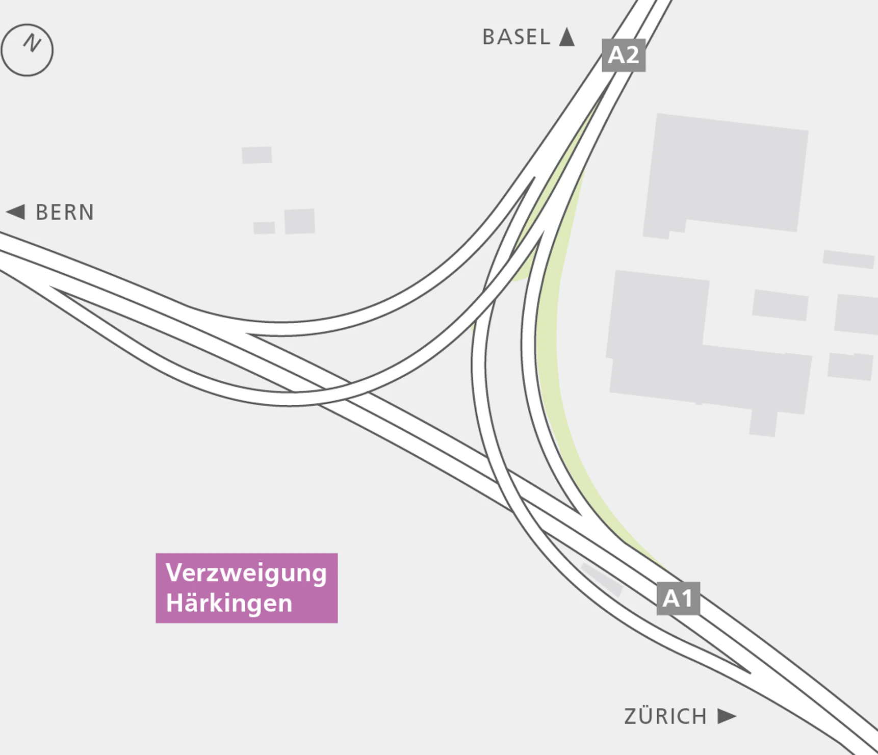 Der Ausbau der Fahrbahnen auf sechs Streifen erfordert einen Umbau der Verbindungsrampen im Verzweigungsbereich Härkingen. Dabei wird eine Fahrspur von Bern kommend auf die A2 in Richtung Basel über die Rampe auf die linke Fahrspur der A2 in Richtung Basel geführt. Die andere Fahrspur der Rampe führt zur Ausfahrt Egerkingen.