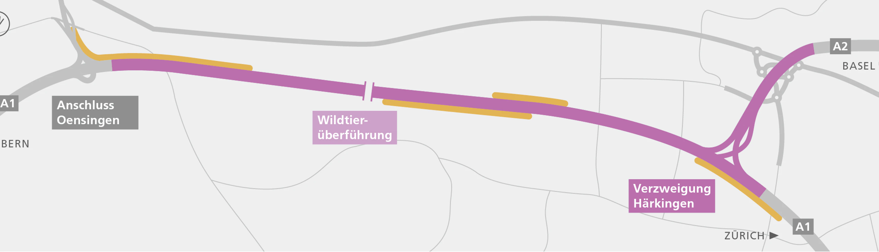 Der Autobahnabschnitt A1 zwischen dem Anschluss Oensingen und der Verzweigung Härkingen sieht neben dem Ausbau auf sechs Streifen eine Wildtierüberführung im Bereich Nieder- und Oberbuchsiten vor. Es werden ausserdem Optimierungsmassnahmen bei der Verzweigung Härkingen vorgenommen.