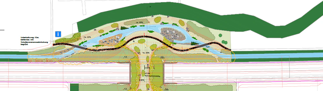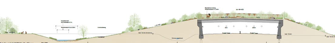 Im Bereich der Wildtierüberführung verläuft der Fluss Dünnern, der aktuell geradlinig entlang der A1 geführt wird. Künftig wird der Fluss bei der Wildtierüberführung in ein natürliches Bachbett überführt. Er wird die Landschaft natürlich prägen, nicht zuletzt zum Wohle der Tiere, die die Überführung queren.