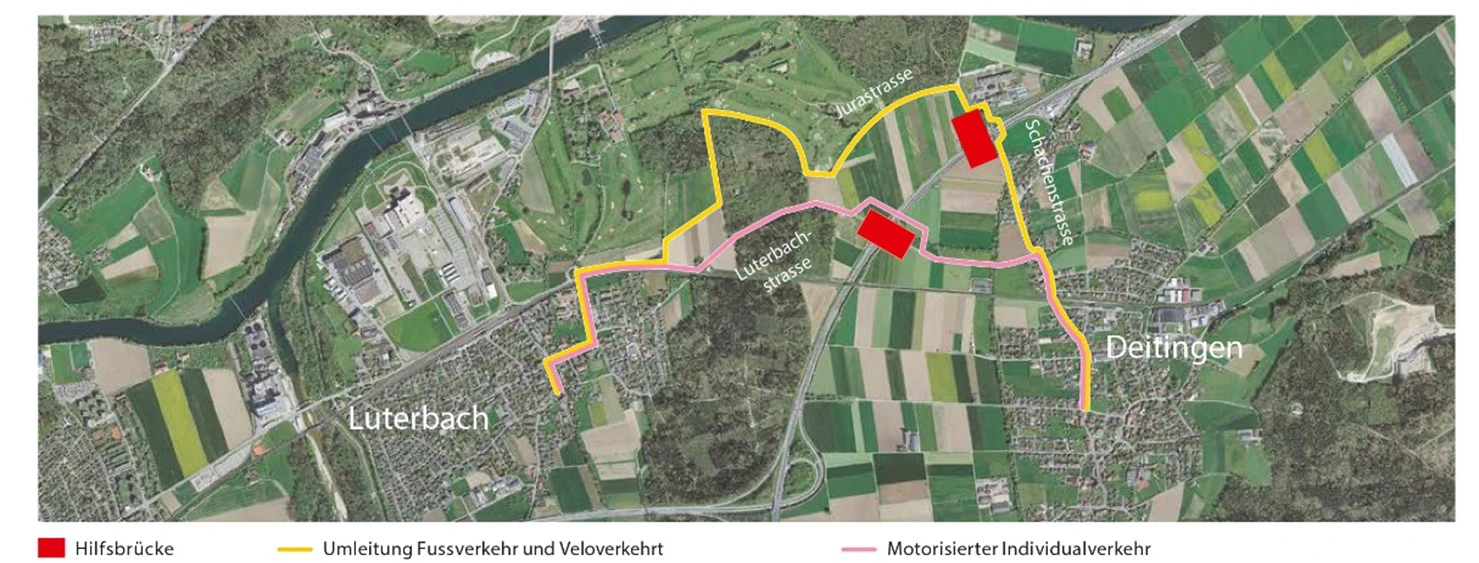 Im Rahmen des 6-Streifen-Ausbaus wird die Autobahn A1 zwischen der Verzweigung Luterbach und Wangen a.A. in mehreren Nächten in den Fahrtrichtungen Zürich und Bern einspurig geführt. Grund dafür ist der Bau zweier Lehrgerüste für die neuen Autobahnüberführungen zwischen Luterbach und Deitingen. Betroffen sind die Luterbach- und Schachenstrasse.