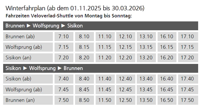 Ab dem 01. November 2025 gilt für den Veloshuttle auf der Axenstrasse zwischen Brunnen und Sisikon der Winterfahrplan. Der Shuttle verkehrt von Montag bis Sonntag gemäss untenstehendem Fahrplan zwischen Brunnen und Sisikon und in der Gegenrichtung.