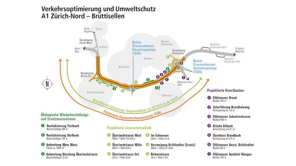 Zwischen Zürich-Nord und Brüttisellen ist ein Anschlussprojekt zur Optimierung des Verkehrsflusses auf der A1 geplant. Kernmassnahme ist die Umnutzung von Pannenstreifen, um Engpässe zu entschärfen. Zusätzlich entstehen Lärmschutzwände, Strassenabwasseranlagen sowie ökologische Ausgleichs- und Ersatzmassnahmen. Die Hauptarbeiten starten voraussichtlich im Jahr 2028.