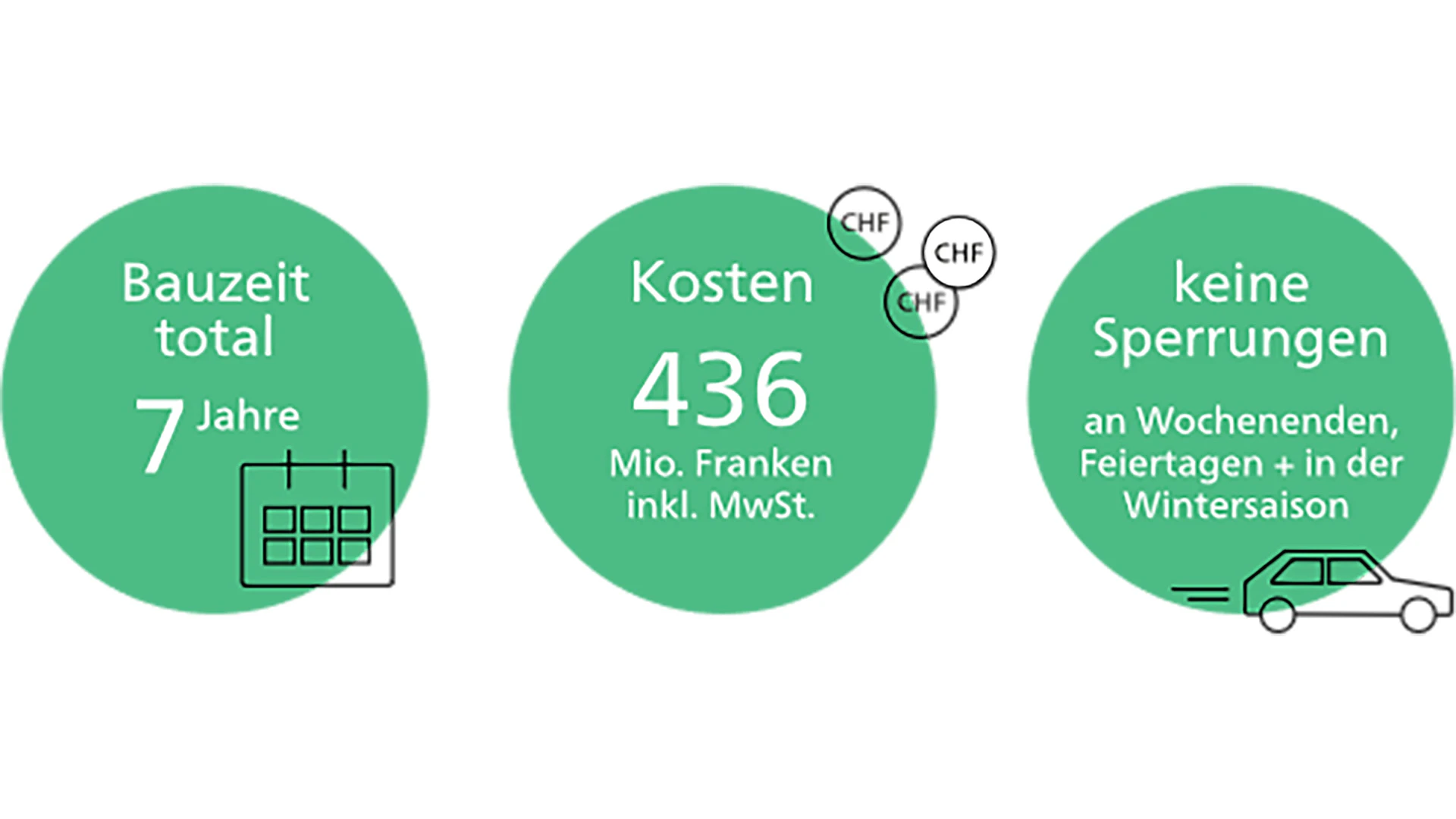 Die Nordumfahrung Zürich gehört zu den am stärksten befahrenen Strassenabschnitten der Schweiz: Mehr als 120 000 Fahrzeuge rollen täglich über die Autobahnstrecke zwischen dem Limmattalerkreuz und der Verzweigung Zürich Nord. Um Kapazitätsgrenzen entgegenzuwirken, wird die Nordumfahrung durchgehend auf zweimal drei Fahrstreifen ausgebaut. Zusätzlich wurde eine dritte Tunnelröhre gebaut. Seit deren Inbetriebnahme im April 2023 läuft die Sanierung der zweiten Röhre und anschliessend diejenige der ersten Röhre. Ab 2028 fliesst der Verkehr durch alle drei Tunnel. Informieren Sie sich hier über das Bauprojekt des Bundesamts für Strassen ASTRA.