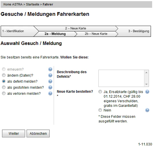 Für eine Online-Meldung müssen Sie sich zuerst identifizieren. Nach der Verifikation Ihrer Angaben erkennt das System, dass für Sie bereits eine Karte ausgestellt wurde und ermöglicht die Auswahl der folgenden Meldungen:
