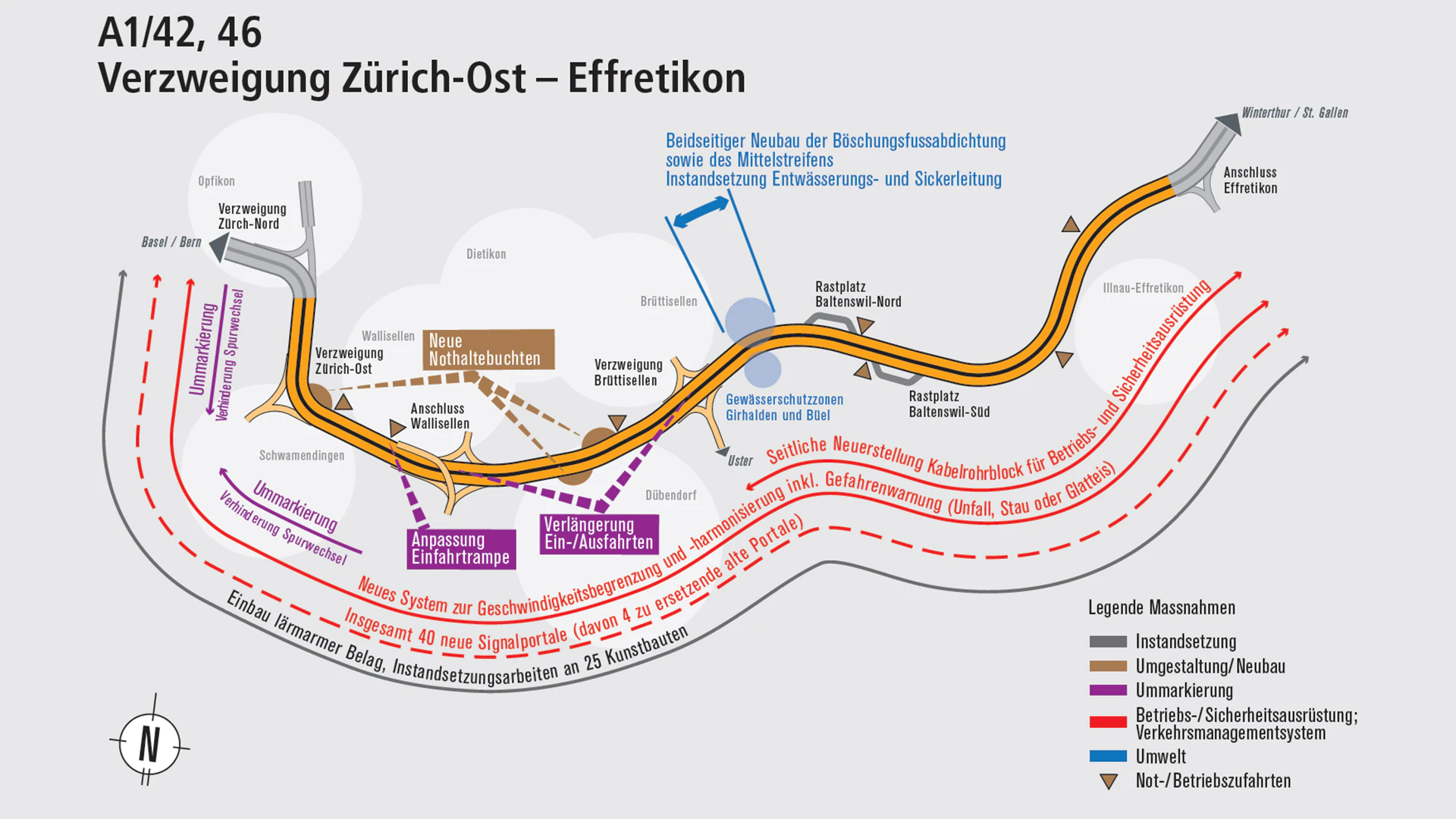 Von 2018 bis 2020 wurde der Autobahnabschnitt zwischen Zürich-Nord und Effretikon umfassend instandgesetzt. In zwölf Bauphasen erneuerte das ASTRA Beläge, Kunstbauten sowie die Betriebs- und Sicherheitsausrüstung und konnte das Projekt Ende 2020 erfolgreich abschliessen.