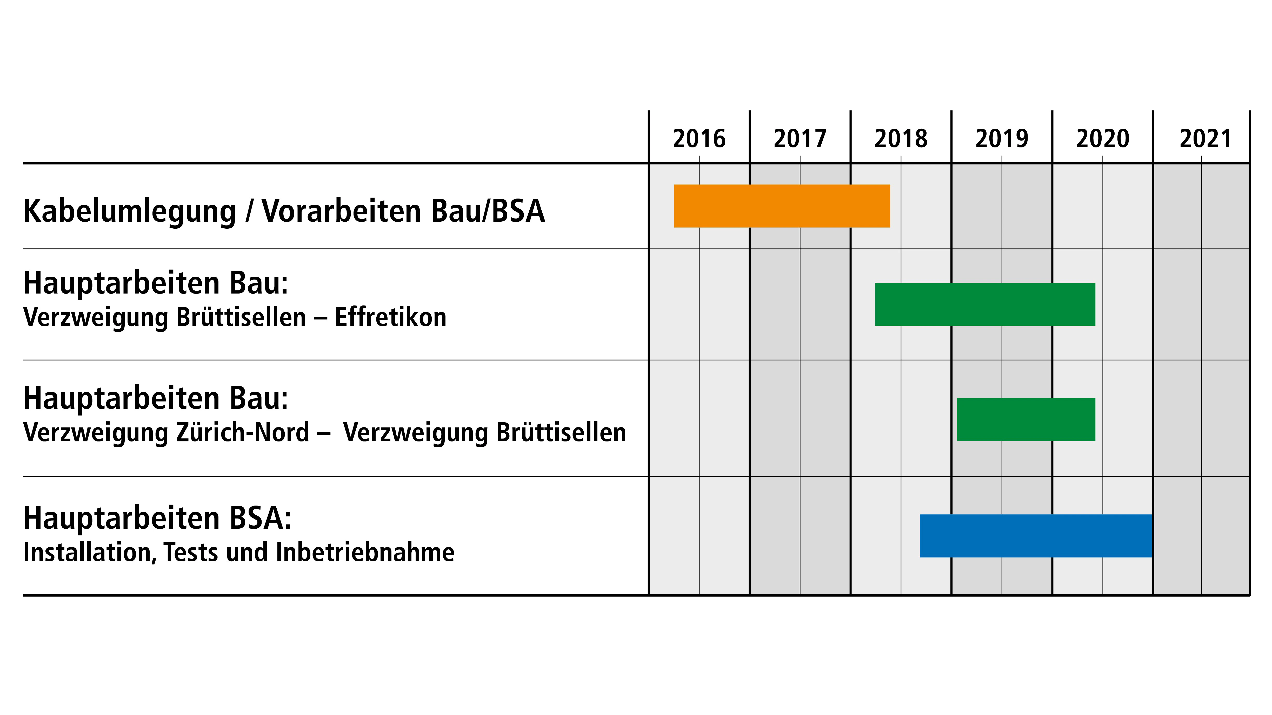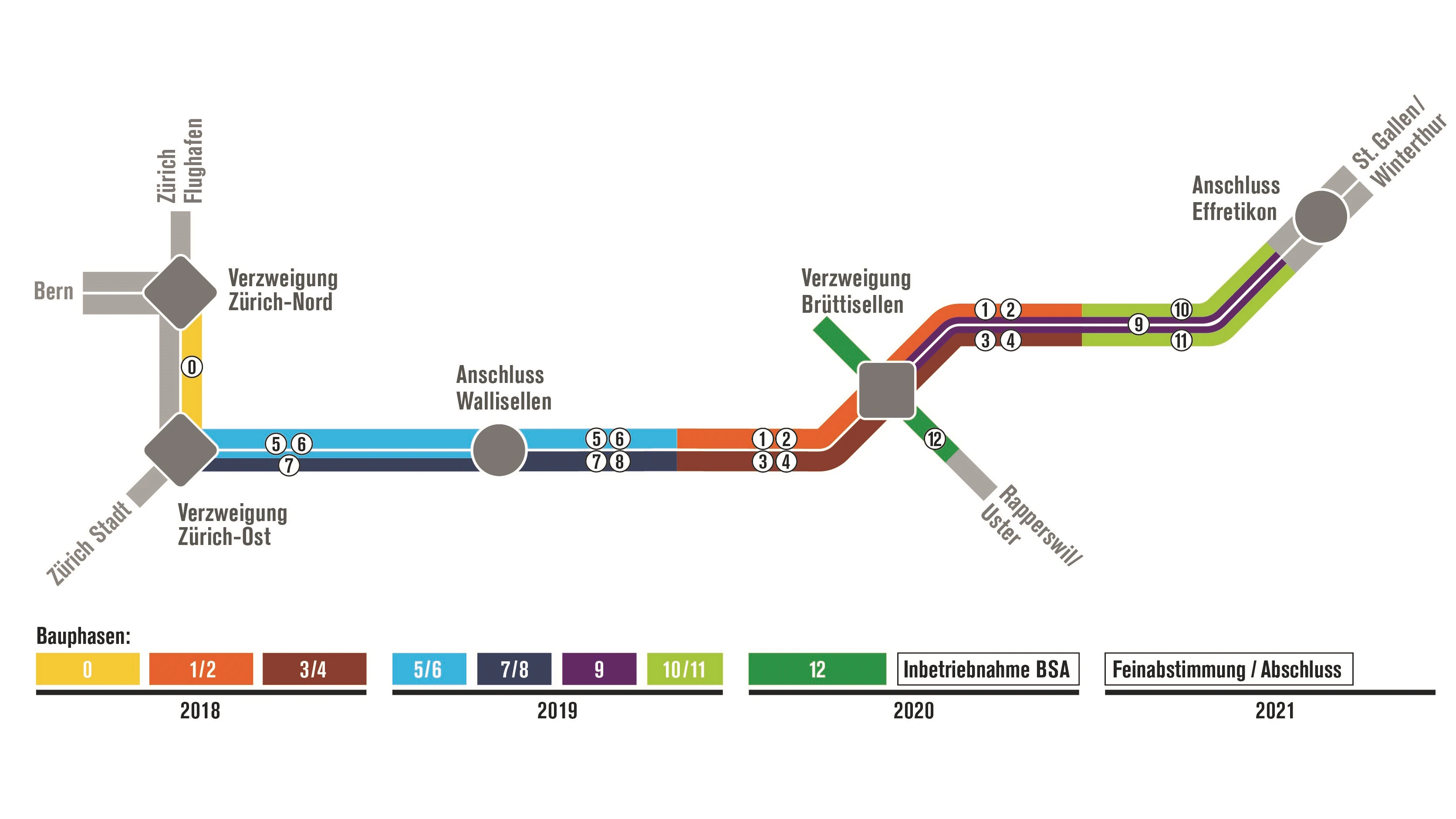 Die Hauptarbeiten Bau starteten im Jahr 2018. Der Schwerpunkt der Arbeiten im Jahr 2020 konzentriert sich auf den Tief- und Strassenbau im Bereich der Verzweigung Brüttisellen. Jede Bauphase dauert 4 bis 8, in Einzelfällen 12 beziehungsweise 28 Wochen (Bauphasen 12 und 9).