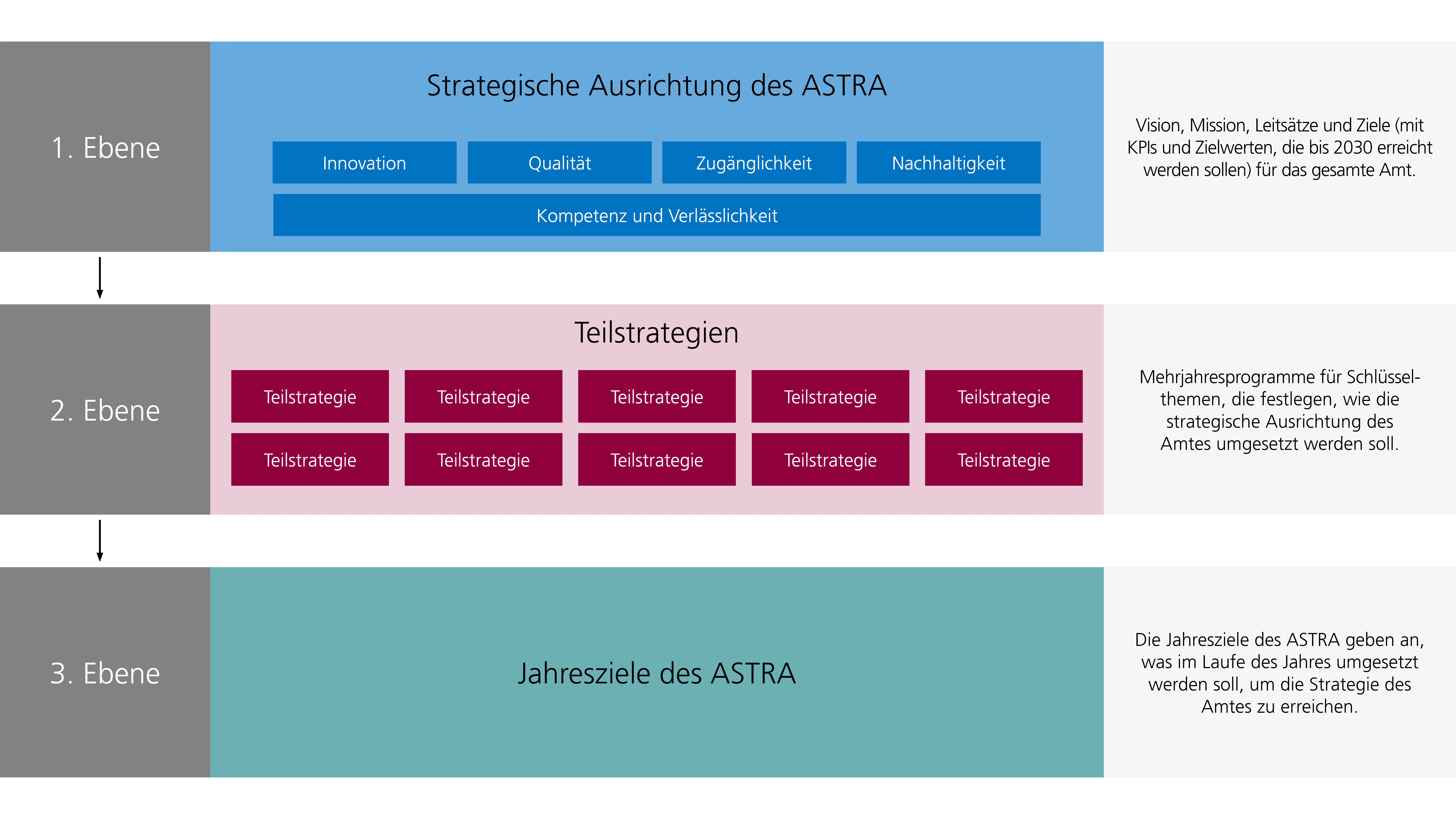 Die erste umfasst die Strategische Ausrichtung, in der die Vision, die Mission, die Leitsätze und die langfristigen Ziele für das gesamte Amt festgelegt sind. Die zweite Ebene beinhaltet die Teilstrategien. Diese fungieren als mehrjährige themenspezifische Programme, die aufzeigen, wie die strategische Ausrichtung umgesetzt werden soll. Die dritte Ebene enthält die vereinbarten Jahresziele des Amtes.