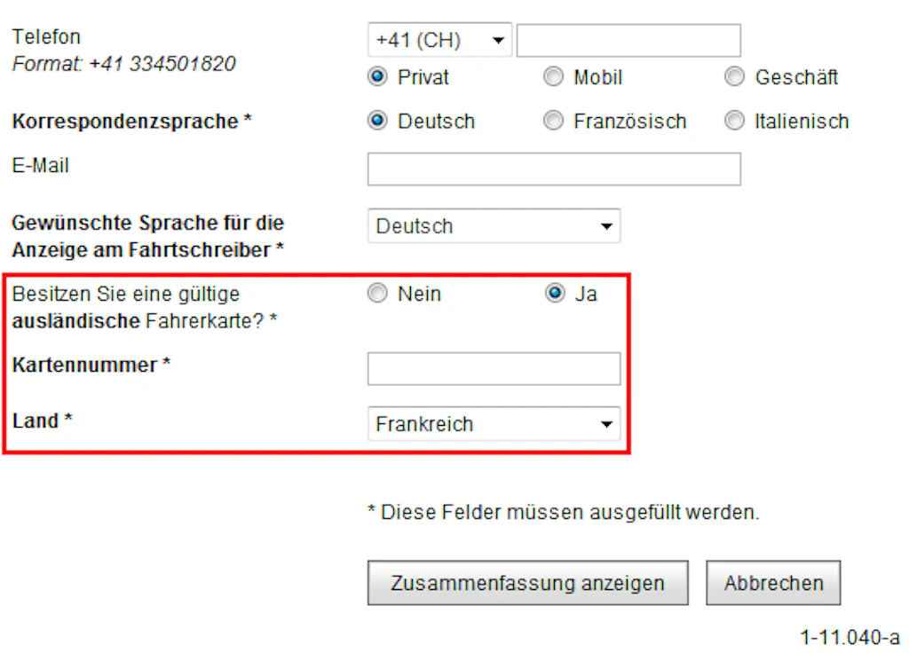 Der Bestellvorgang ist praktisch identisch wie wenn eine neue Fahrerkarte bestellt wird. Wenn es sich um einen Umtausch handelt, muss in der Maske die folgende Information ausgefüllt werden:
