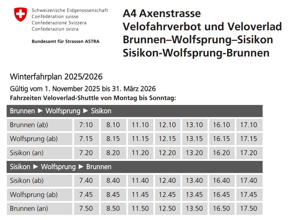 - Als Ersatzmassnahme bietet das ASTRA einen kostenlosen Transport für Personen mit Velos, Motorfahrrädern und ähnlichen Fahrzeugen an. Der Veloverlad-Shuttlebus verbindet folgende Haltestellen: