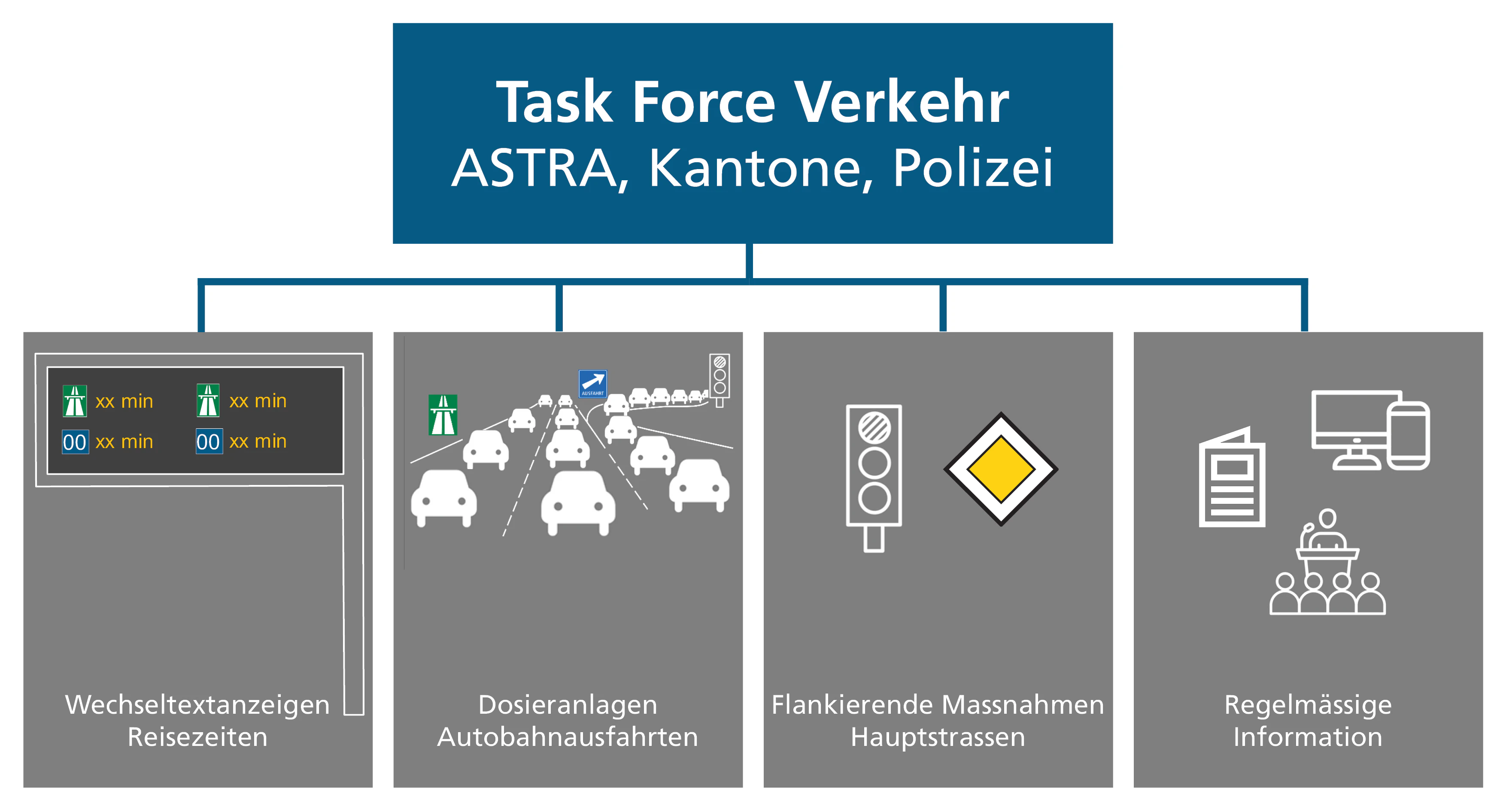 sich regelmässig, um schnell und effektiv Lösungen für unmittelbare Herausforderungen zu finden. Dabei wird geprüft und entschieden, ob zusätzliche Massnahmen zum Schutz der Dörfer vor dem Ausweichverkehr notwendig sind. Bei ausserordentlichen