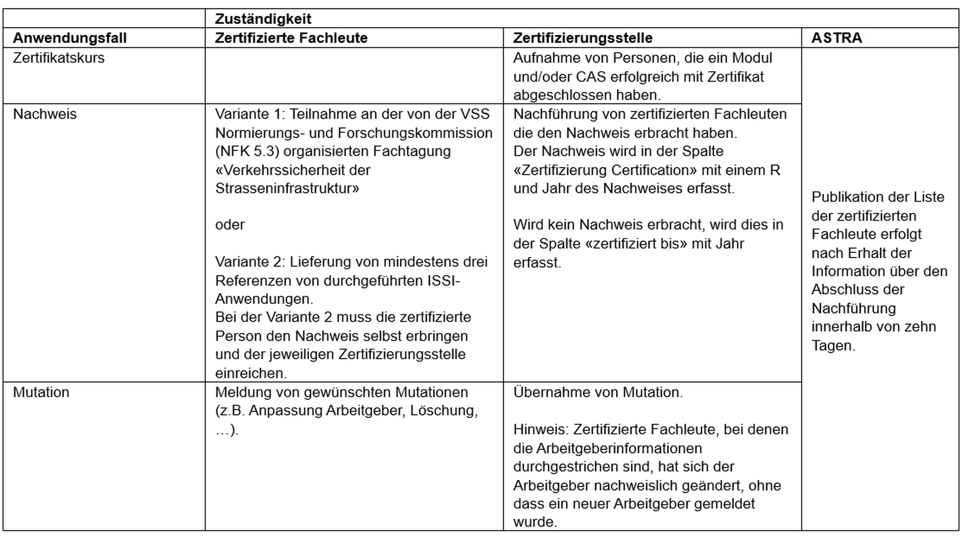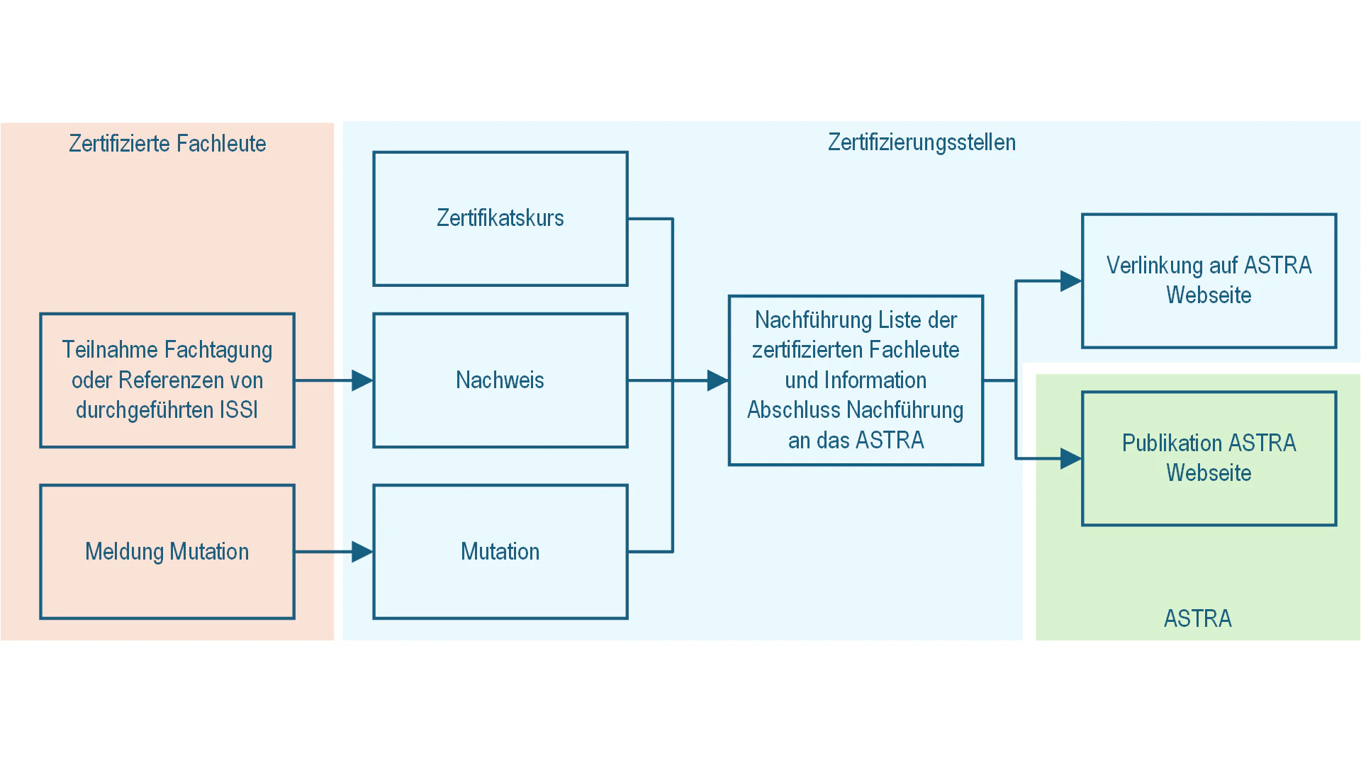 Das ASTRA führt eine Liste der zertifizierten Fachleute. Diese enthält alle von den Zertifizierungsstellen gemeldeten Fachleute.