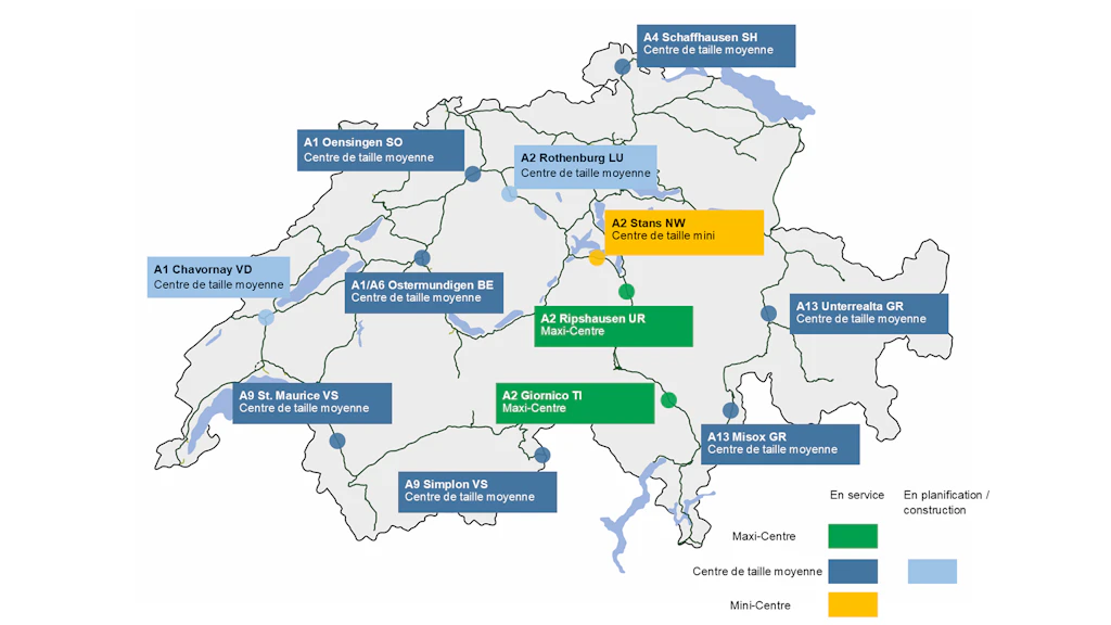 La Suisse compte aujourd’hui huit centres de contrôle du trafic lourd en service. Ils sont situés sur les axes nord-sud et est-ouest, ainsi que sur d’autres tronçons autoroutiers très fréquentés par les poids lourds. Sur l’autoroute A2, un autre centre de contrôle a été mis en service à Giornico (TI) en automne 2022. Les capacités de contrôle sur l’axe nord-sud sont ainsi constamment augmentées.