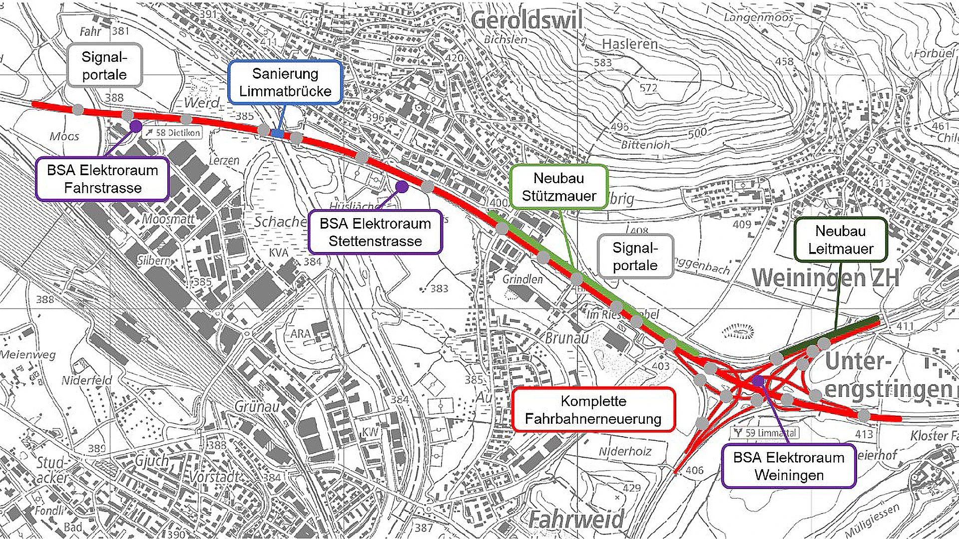 Die Arbeiten umfassten den Einbau eines lärmarmen Belags im gesamten Abschnitt, die Instandsetzung der Kunstbauten (u. a. Limmatbrücke Nord und Süd) sowie den Ersatz der Betriebs- und Sicherheitsausrüstung (BSA). Zudem wurden die Fahrzeugrückhaltesysteme (z. B. Leitplanken) erneuert und die Entwässerung der Fahrbahn angepasst. Ausserdem wurde der gesamte Abschnitt den heute gültigen Gesetzen, Normen und Richtlinien angepasst. Damit soll die Verkehrssicherheit auch für die die kommenden Jahre gewährleistet werden.