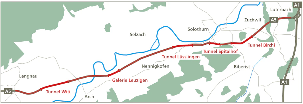 A5 zwischen den Anschlüssen Lengnau und Luterbach im Kanton Solothurn.